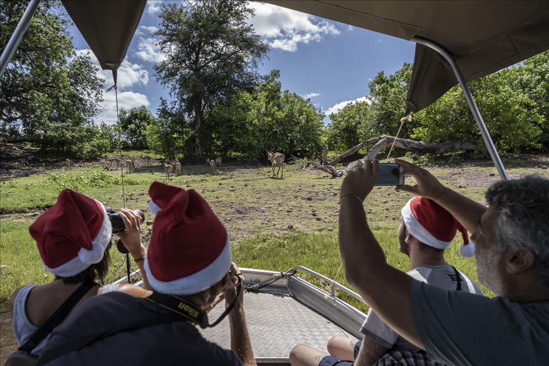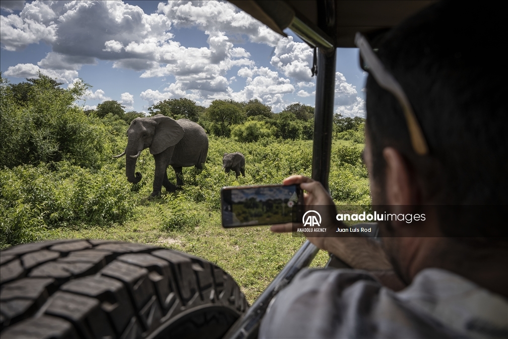 KASANE, BOTSWANA - DECEMBER 24: A tourist takes a photo of the elephants at the Chobe National Park in Kalahari desert at Kasane, Botswana on December 24, 2022. Chobe National Park is the 3rd biggest national park in the country. The park hosts various animals including elephants, tigers, gazelles, giraffes. ( Juan Luis Rod - Anadolu Agency )Juan Luis Rod