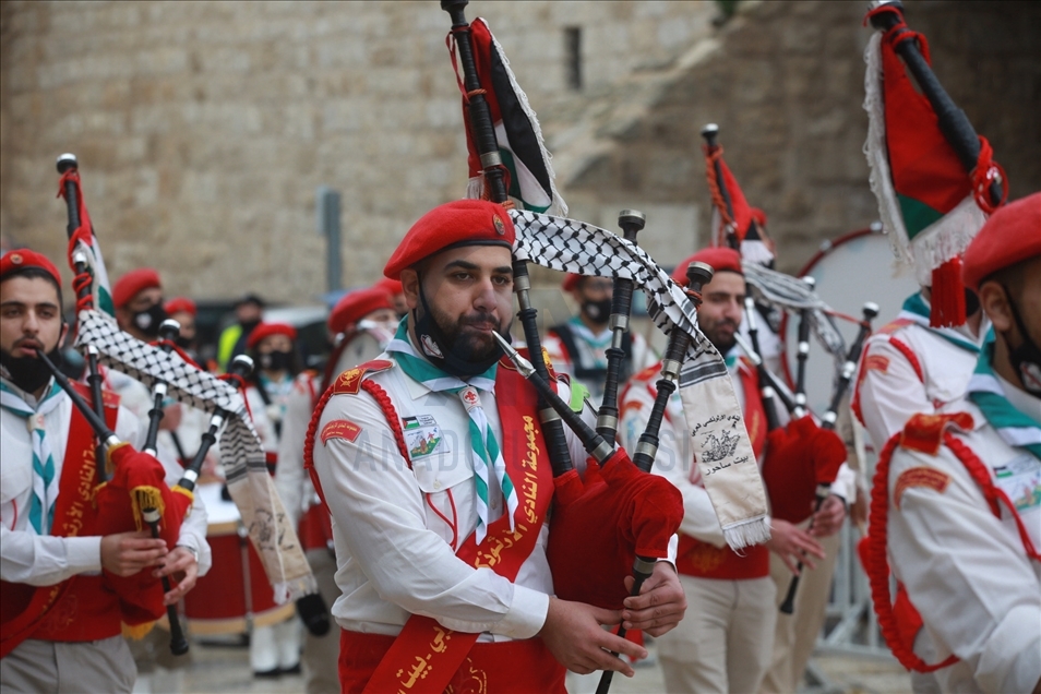 Palestinian marching band parade as part of Christmas celebrations in Bethlehem, West Bank on December 24, 2020.