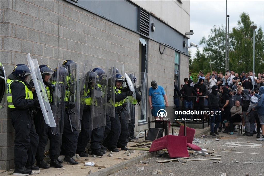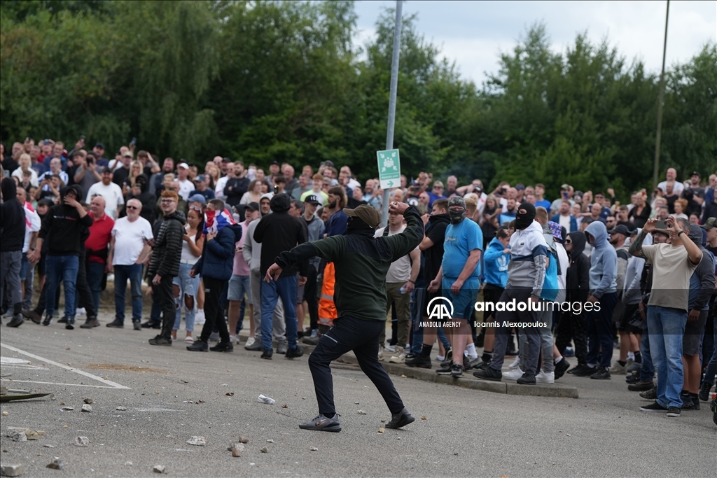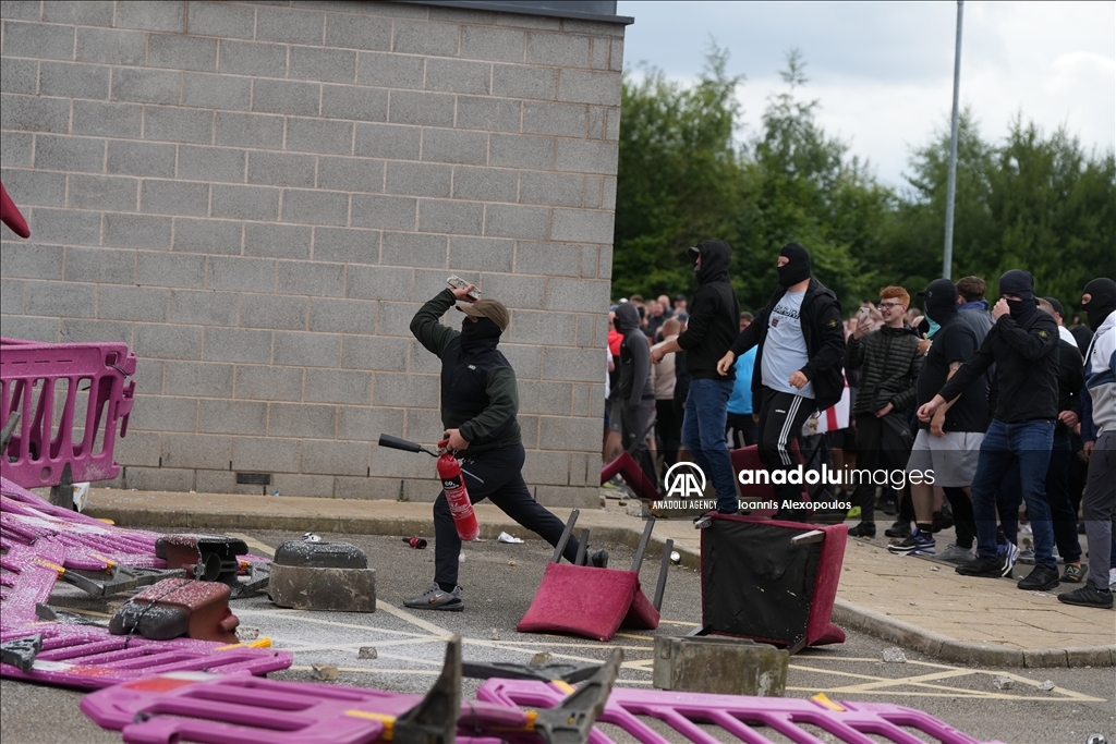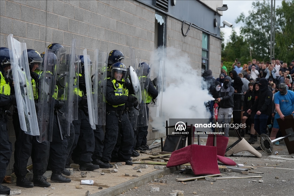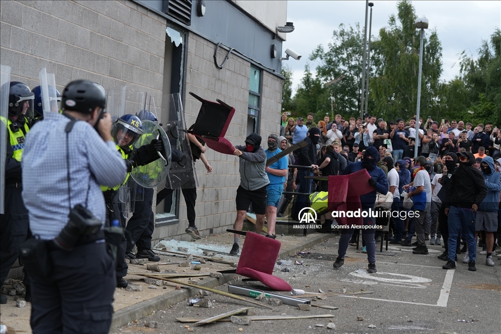 ROTHERHAM, UNITED KINGDOM - AUGUST 04: People, carrying placards, attend an anti-racism protest outside Holiday Inn Express in Rotherham, South Yorkshire, United Kingdom on August 4, 2024. ( Ioannis Alexopoulos - Anadolu Agency )Ioannis Alexopoulos