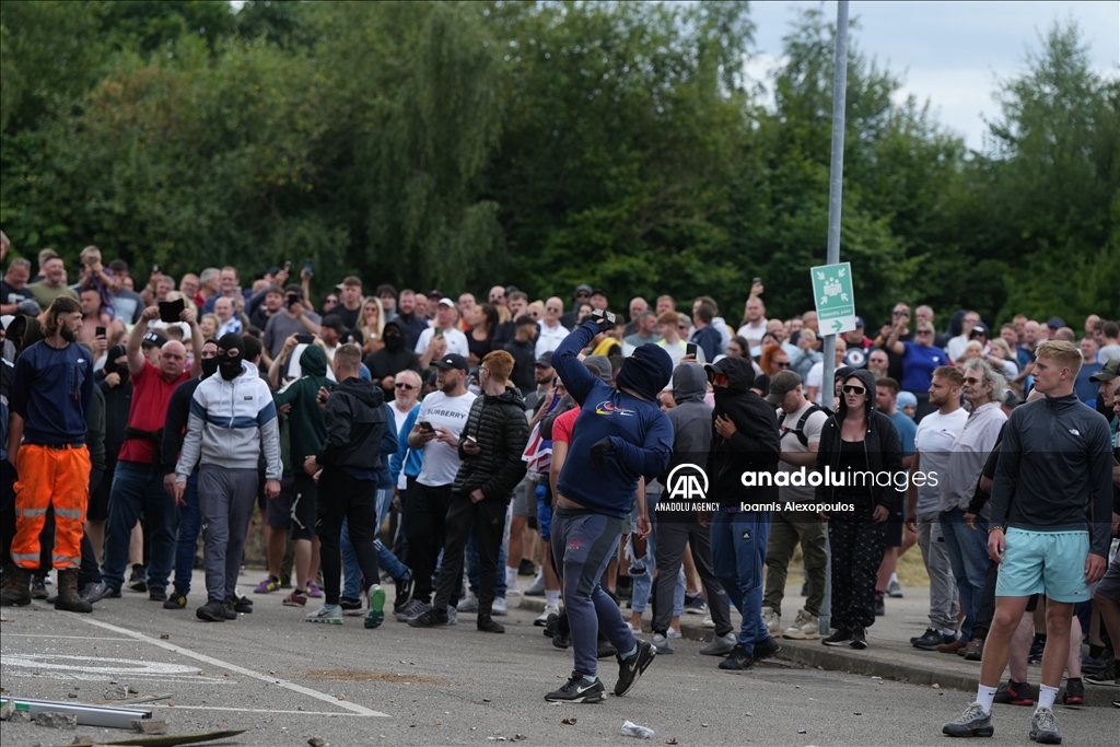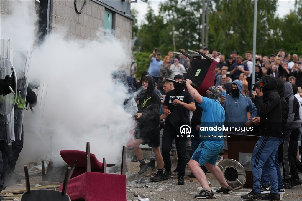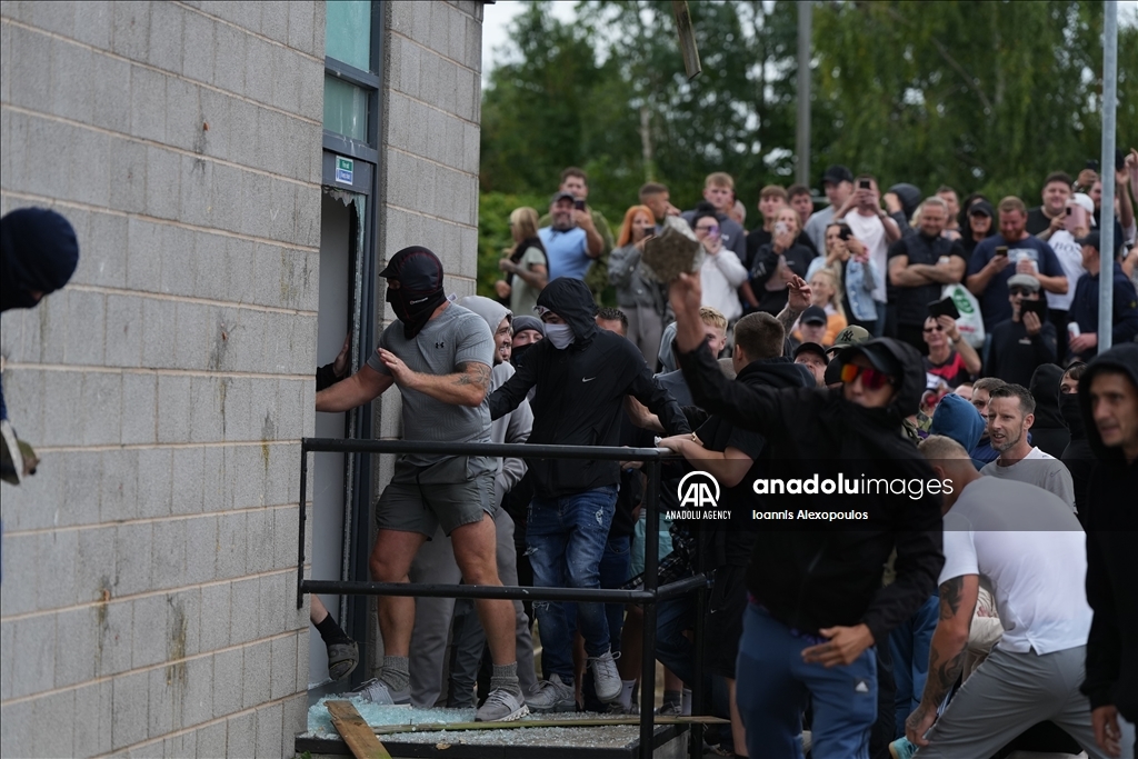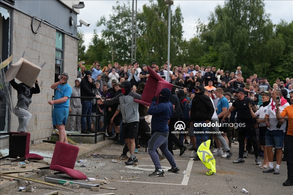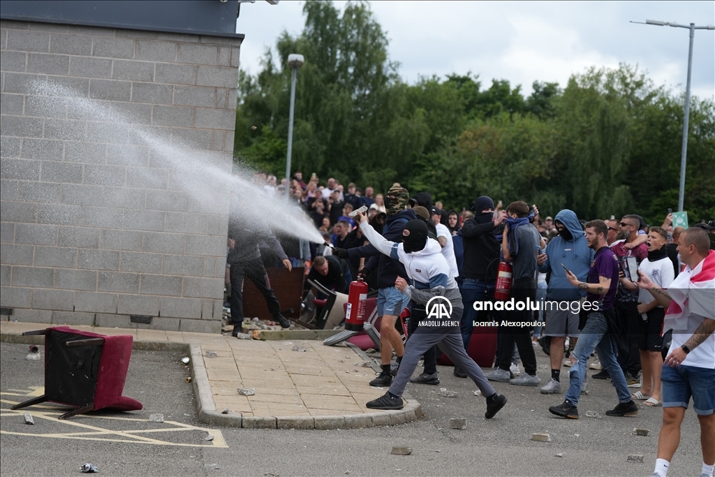 ROTHERHAM, UNITED KINGDOM - AUGUST 04: People, carrying placards, attend an anti-racism protest outside Holiday Inn Express in Rotherham, South Yorkshire, United Kingdom on August 4, 2024. ( Ioannis Alexopoulos - Anadolu Agency )Ioannis Alexopoulos