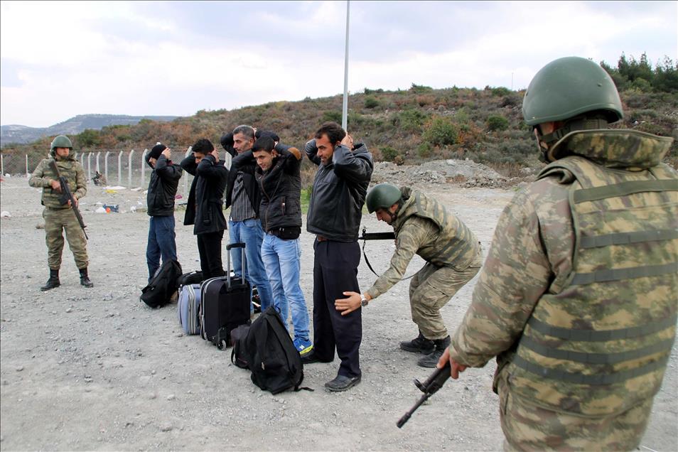HATAY, TURKEY - JANUARY 5: A Turkish soldier frisks the people who tried to cross into Turkey from Syria illegally in Hatay, Turkey on January 5, 2016. Security measures are being heightened at the Syrian border in Yayladagi district, Hatay, where over a hundred thousand people and four thousand smuggled animals have been caught over the last year. The border is guarded 24 hours a day with armored vehicles and work has begun to construct a 4-meter high "concrete block" wall in the district and neighboring Altinozu.