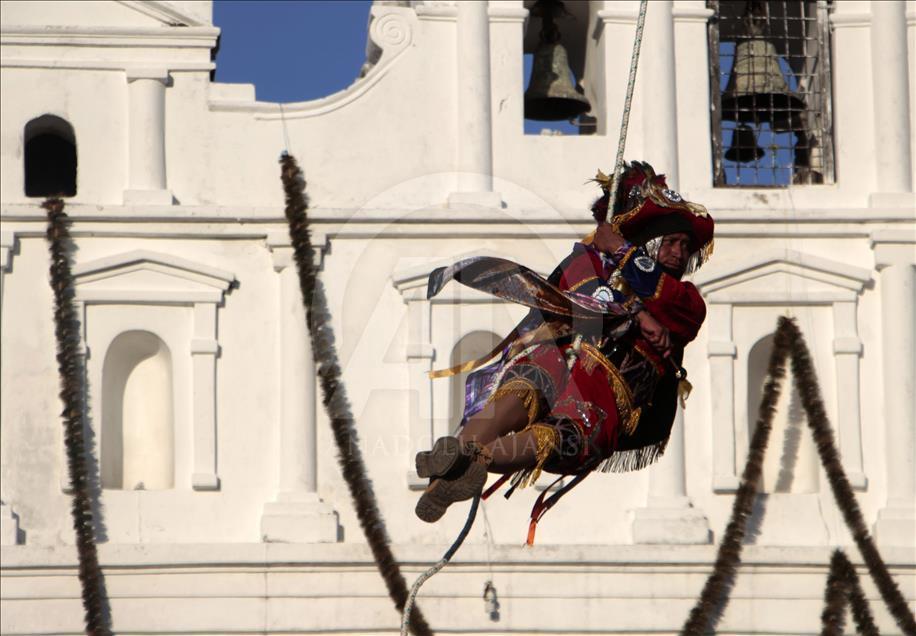 CUBULCO, GUATEMALA - JULY 25 A dancer passes the church of Cubulco as he sways in the air with the flying Palo peaking at a height of 32 meters during the presentation of the flying stick (32 meters) in Cubulco, Guatemala on July 25, 2016. ( JOSUE DECAVELE - Anadolu Agency )JOSUE DECAVELE