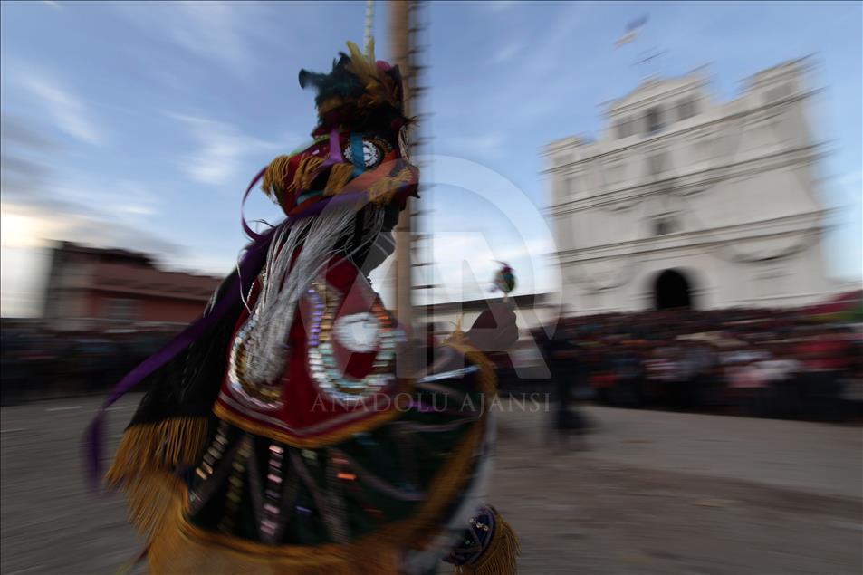 CUBULCO, GUATEMALA - JULY 25 Dancers pass the church of Cubulco as he sways in the air with the flying Palo peaking at a height of 32 meters during the presentation of the flying stick (32 meters) in Cubulco, Guatemala on July 25, 2016. ( JOSUE DECAVELE - Anadolu Agency )JOSUE DECAVELE