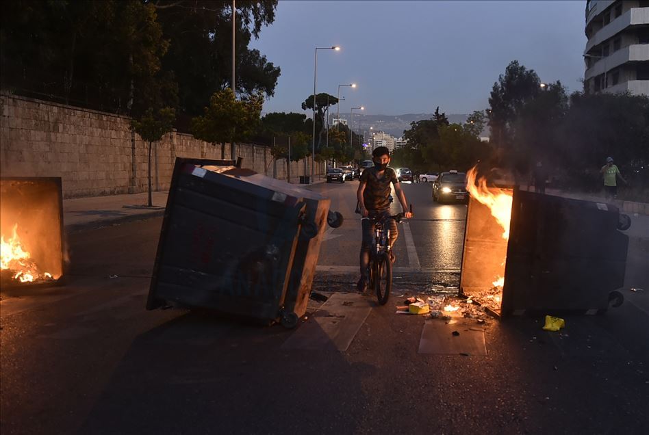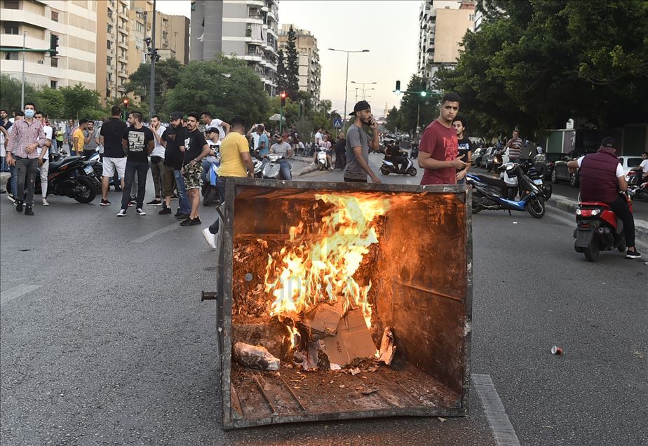 BEIRUT, LEBANON - JUNE 11: Protesters block a street by setting trash bins on fire during a demonstration against depreciation in the value of the Lebanese pound against the dollar due to the coronavirus (COVID-19) pandemic in the Lebanese capital Beirut on June 11, 2020. ( Houssam Shbaro - Anadolu Agency )Houssam Shbaro