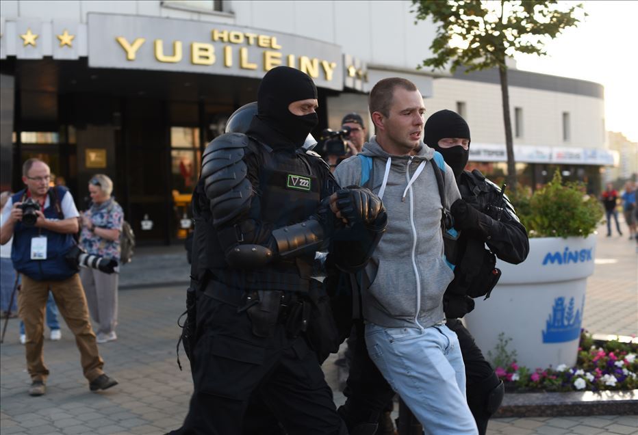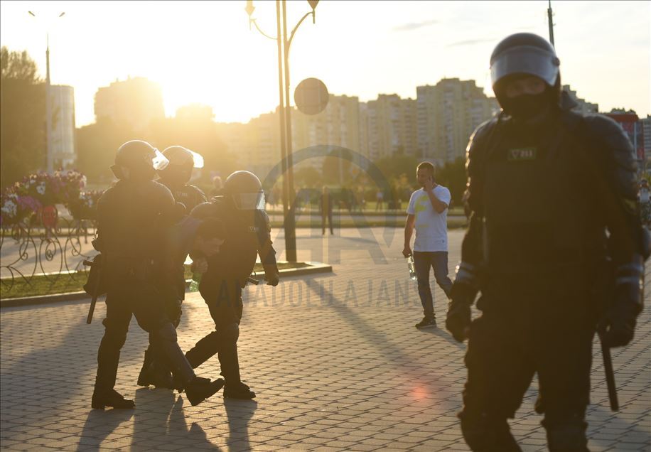 MINSK, BELARUS - AUGUST 10: Security officers take some of protestors into custody who gather at streets after the early election results in Minsk, Belarus on August 10, 2020. Belarusian President Alexander Lukashenko won a sixth term in office with over 80% of the vote, the country's election commission said Monday. Officials maintain the results are valid, however, the opposition candidates protested the results, supported by thousands of people who took to the streets throughout the country.