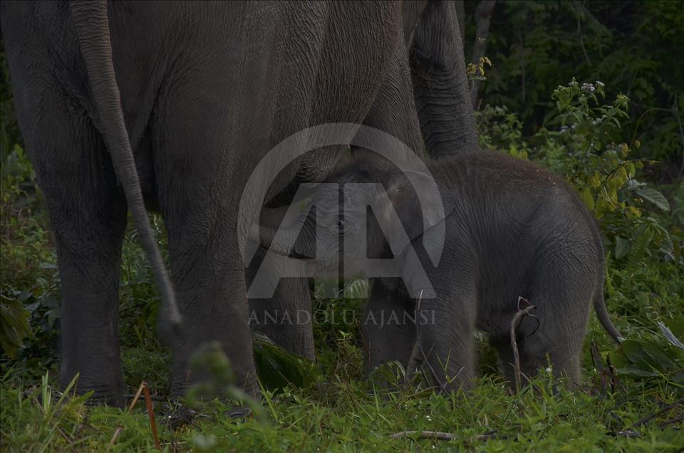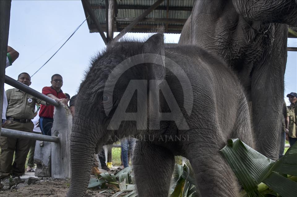 RIAU, INDONESIA - NOVEMBER 24 : A newly born baby Sumatran elephant stands next to her mother in Elephant Flying Squad Camp at Tesso Nilo National Park in Riau, Indonesia, on Nov. 23, 2017. The elephant baby named Harmoni Rimbo was born on Nov. 21, 2017 -- the result of breeding between a wild elephant and a tamed female elephant from the Flying Squad WWF and Riau Natural Resource Conservation Center (BBKSDA). Indonesia's endangered elephants are threatened by a shrinking habitat due to deforestation. Only 3,000 Sumatran elephants are believed to remain in the wild.Wahyudi