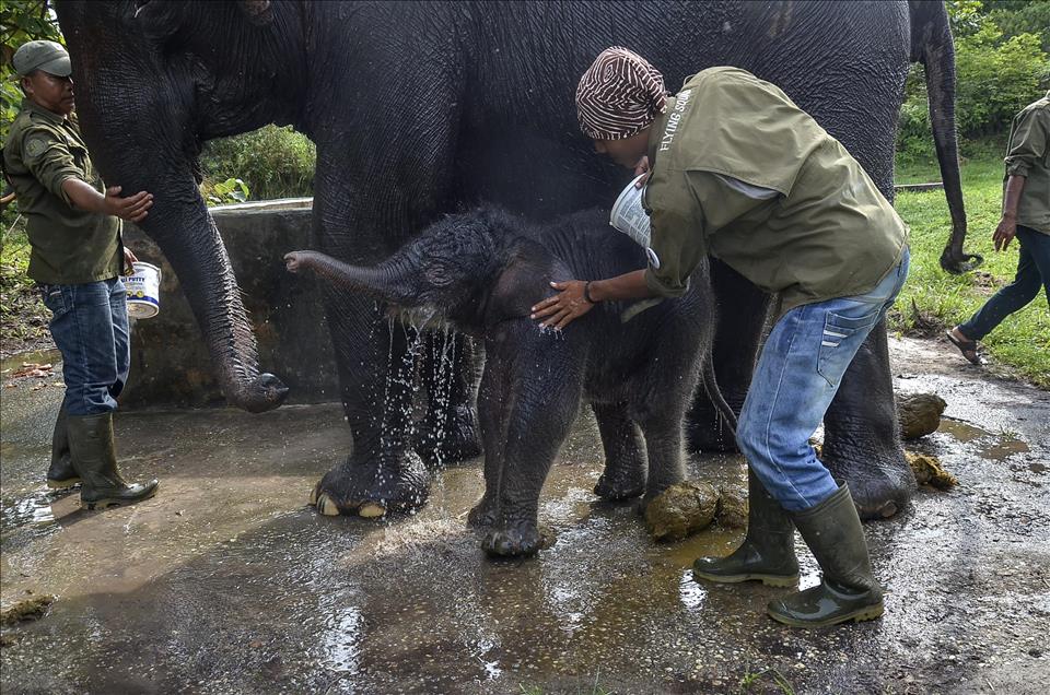 RIAU, INDONESIA - NOVEMBER 24 : A newly born baby Sumatran elephant stands next to her mother as they take a shower in Elephant Flying Squad Camp at Tesso Nilo National Park in Riau, Indonesia, on Nov. 23, 2017. The elephant baby named Harmoni Rimbo was born on Nov. 21, 2017 -- the result of breeding between a wild elephant and a tamed female elephant from the Flying Squad WWF and Riau Natural Resource Conservation Center (BBKSDA). Indonesia's endangered elephants are threatened by a shrinking habitat due to deforestation. Only 3,000 Sumatran elephants are believed to remain in the wild.Wahyudi