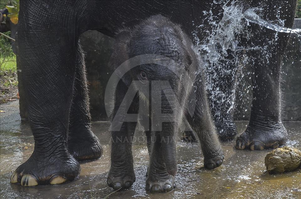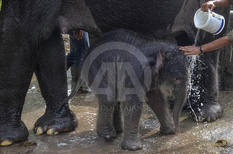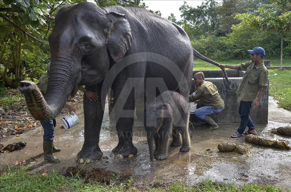 RIAU, INDONESIA - NOVEMBER 24 : A newly born baby Sumatran elephant stands next to her mother as they take a shower in Elephant Flying Squad Camp at Tesso Nilo National Park in Riau, Indonesia, on Nov. 23, 2017. he elephant baby named Harmoni Rimbo was born on Nov. 21, 2017 -- the result of breeding between a wild elephant and a tamed female elephant from the Flying Squad WWF and Riau Natural Resource Conservation Center (BBKSDA). Indonesia's endangered elephants are threatened by a shrinking habitat due to deforestation. Only 3,000 Sumatran elephants are believed to remain in the wild.Wahyudi