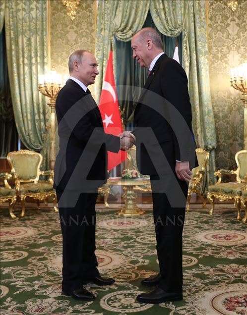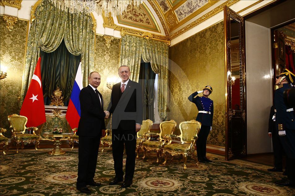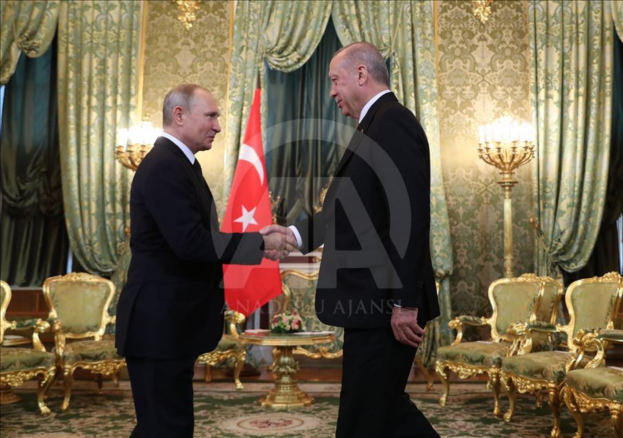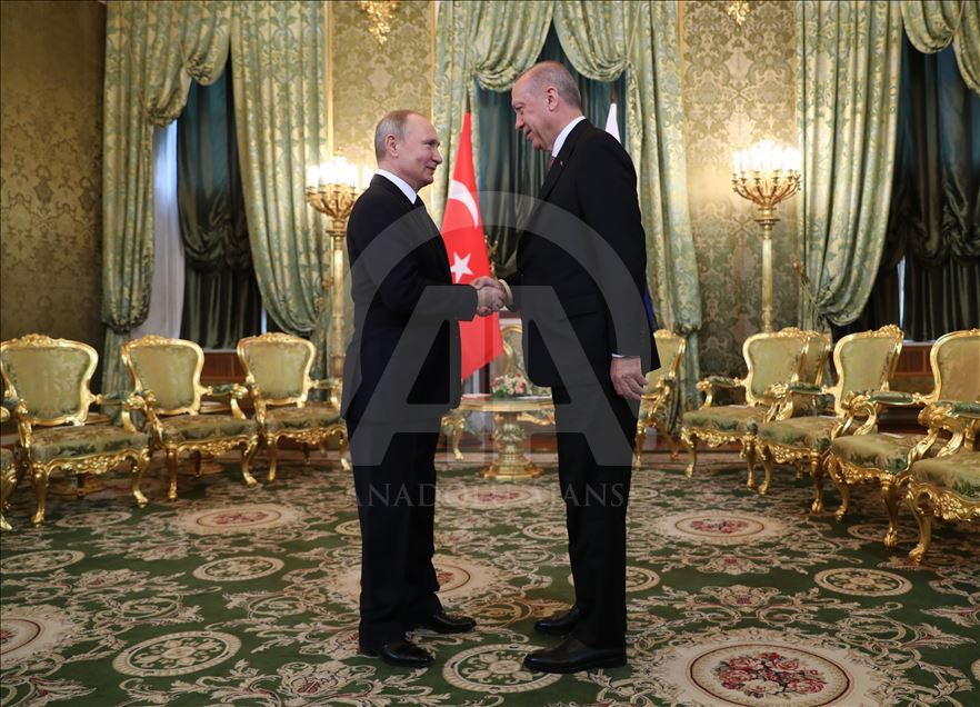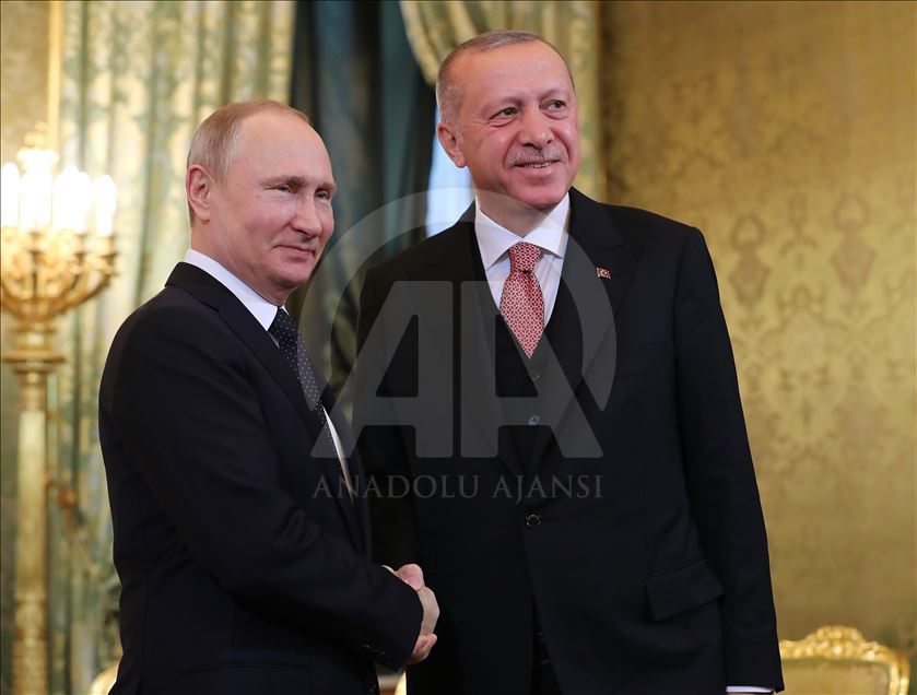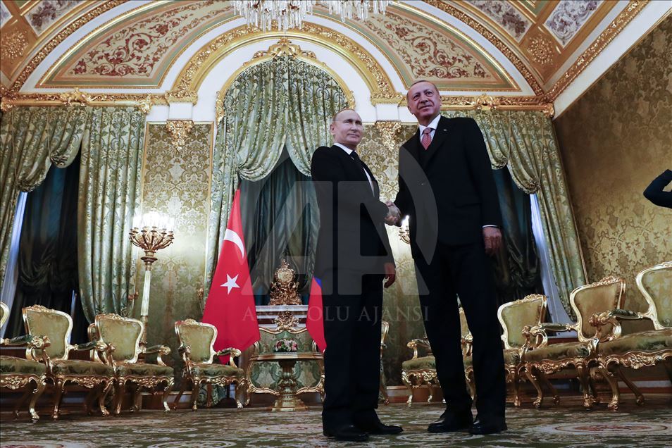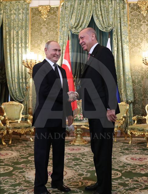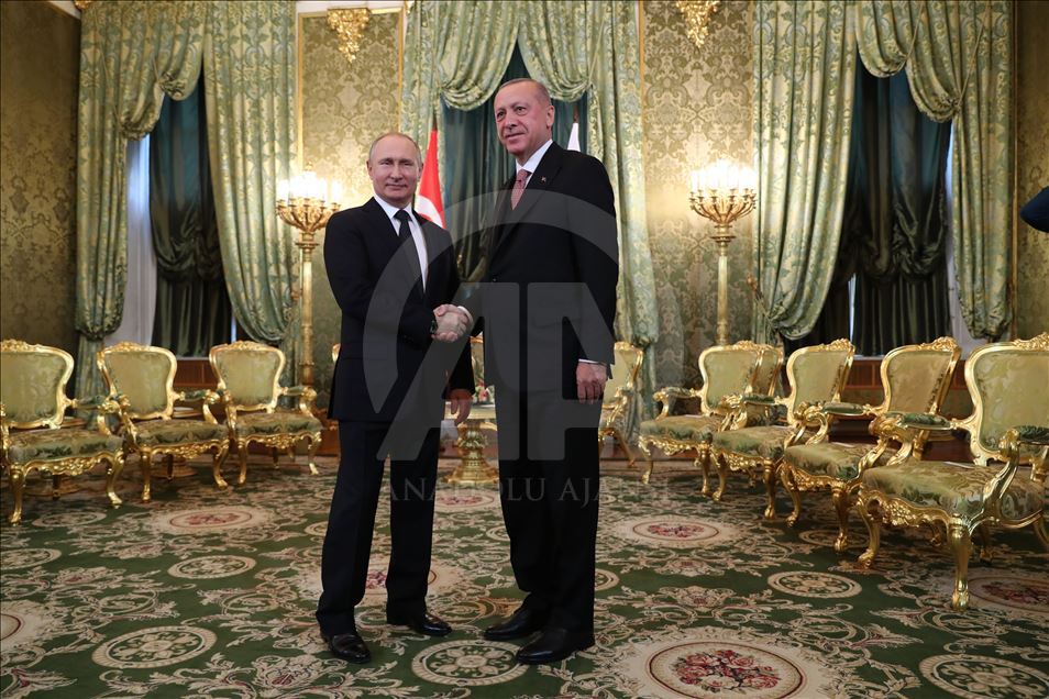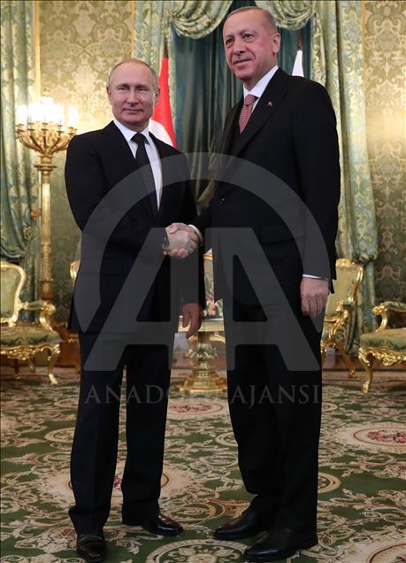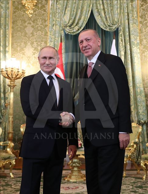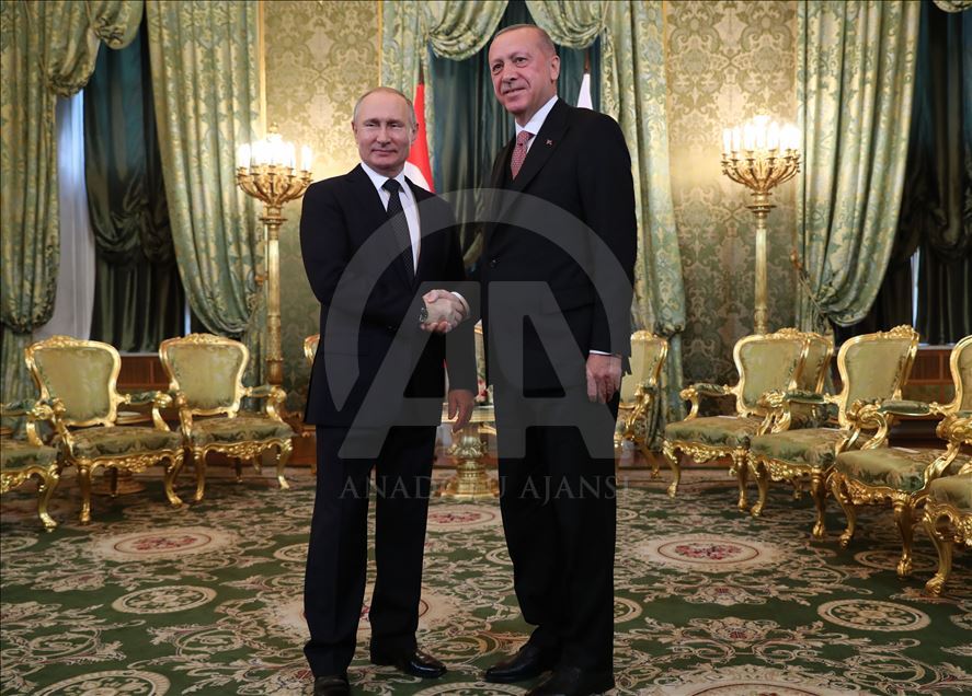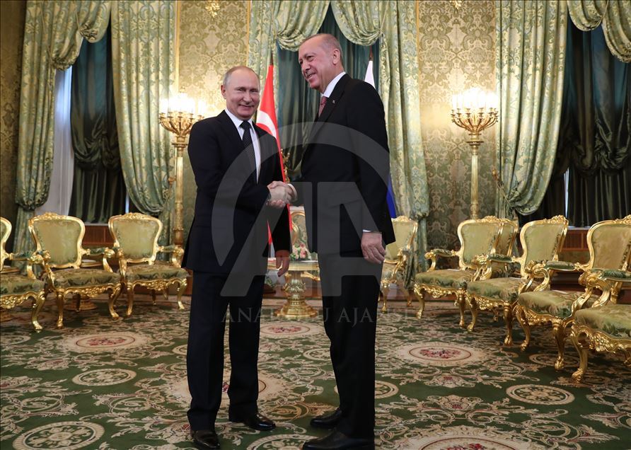MOSCOW, RUSSIA - APRIL 08: (----EDITORIAL USE ONLY – MANDATORY CREDIT - "TURKISH PRESIDENCY / KAYHAN OZER / HANDOUT" - NO MARKETING NO ADVERTISING CAMPAIGNS - DISTRIBUTED AS A SERVICE TO CLIENTS----) Turkish President Recep Tayyip Erdogan (R) meets Russian President Vladimir Putin (L) at Kremlin Palace in Moscow, Russia on April 08, 2019. ( Turkish Presidency / KAYHAN OZER - Anadolu Agency )Turkish Presidency / KAYHAN OZER