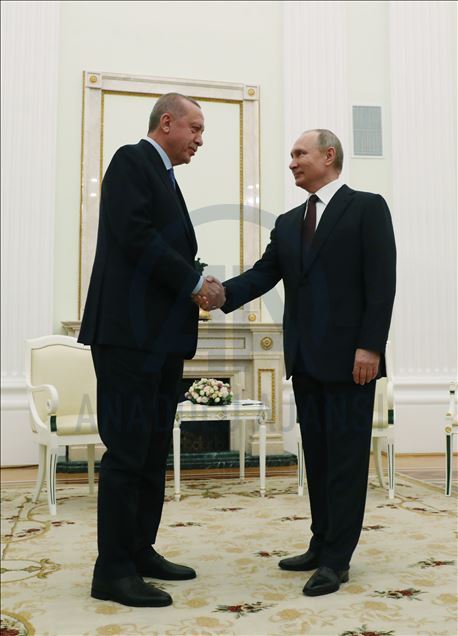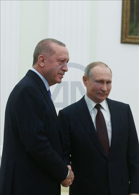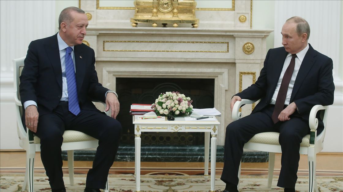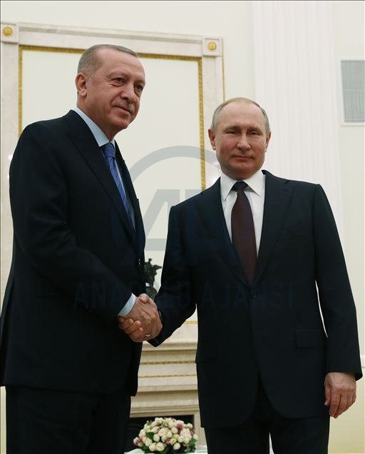 MOSCOW, RUSSIA - MARCH 5: (----EDITORIAL USE ONLY – MANDATORY CREDIT - "TURKISH PRESIDENCY / MURAT CETINMUHURDAR / HANDOUT" - NO MARKETING NO ADVERTISING CAMPAIGNS - DISTRIBUTED AS A SERVICE TO CLIENTS----) Turkish President Recep Tayyip Erdogan (L) meets Russian President Vladimir Putin (R) in Moscow, Russia on March 5, 2020. ( Turkish Presidency / Murat Cetinmuhurdar / Handout - Anadolu Agency )Turkish Presidency / Murat Cetinmuhurdar / Handout