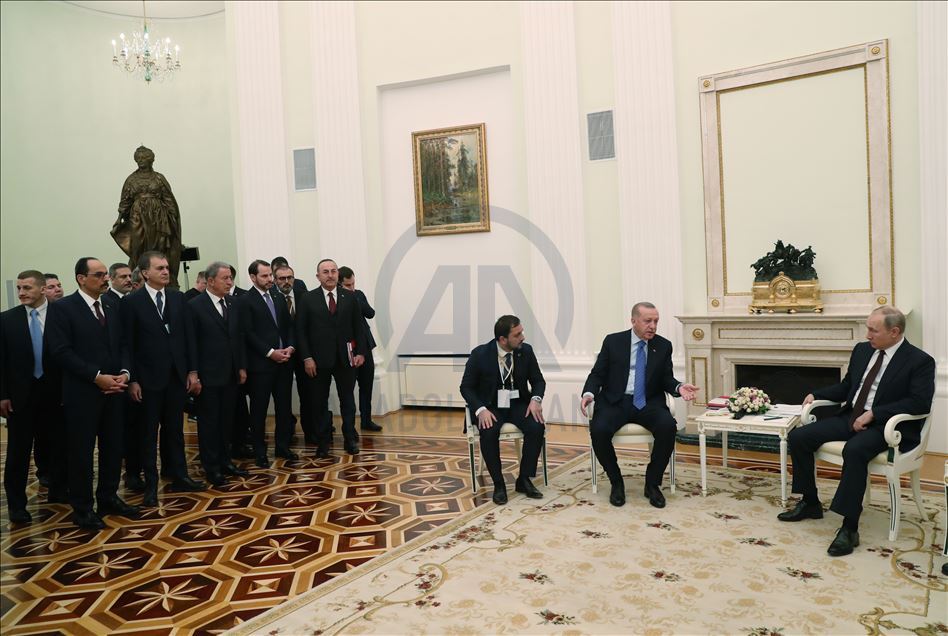 MOSCOW, RUSSIA - MARCH 5: (----EDITORIAL USE ONLY – MANDATORY CREDIT - "TURKISH PRESIDENCY / MURAT CETINMUHURDAR / HANDOUT" - NO MARKETING NO ADVERTISING CAMPAIGNS - DISTRIBUTED AS A SERVICE TO CLIENTS----) Turkish President Recep Tayyip Erdogan (2nd R) meets Russian President Vladimir Putin (R) in Moscow, Russia on March 5, 2020. ( Turkish Presidency / Murat Cetinmuhurdar / Handout - Anadolu Agency )Turkish Presidency / Murat Cetinmuhurdar / Handout
