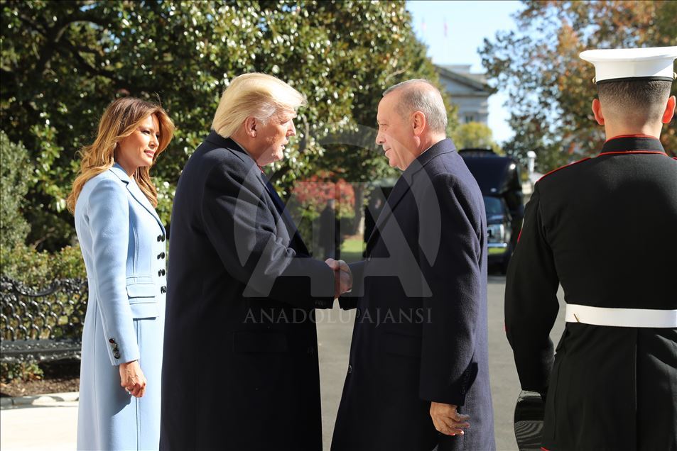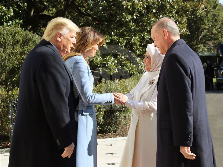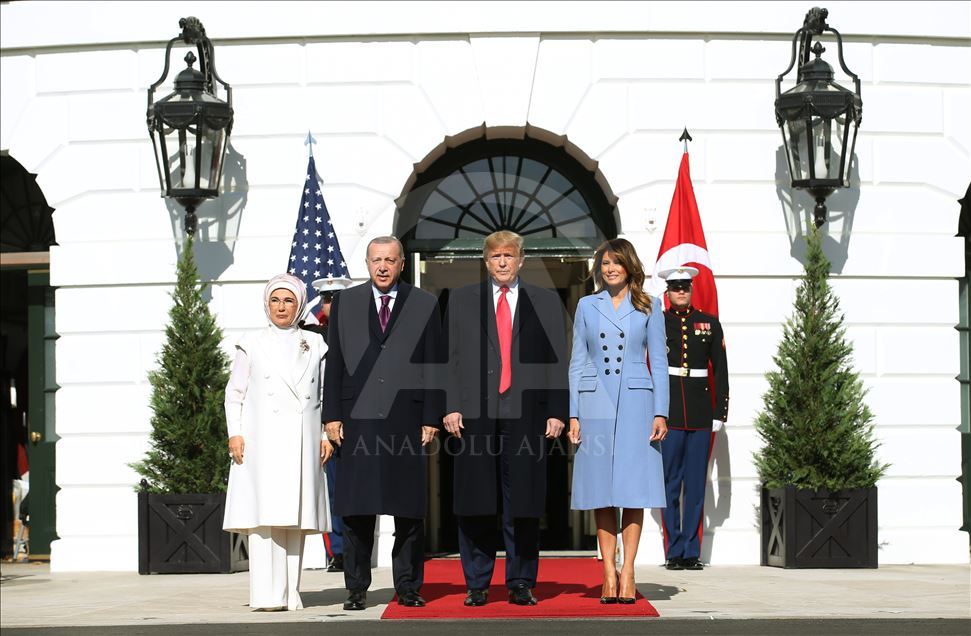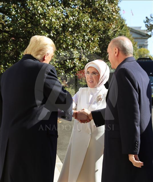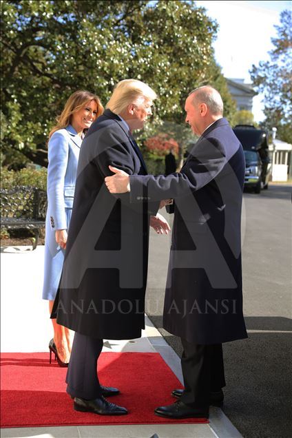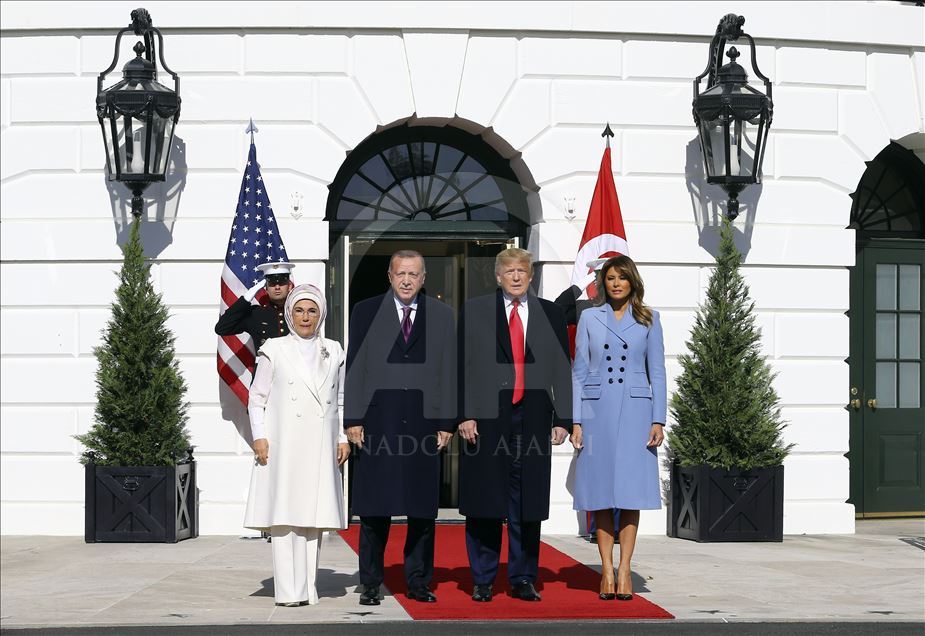 WASHINGTON, USA - NOVEMBER 13: President of Turkey Recep Tayyip Erdogan (2nd L) and his wife Emine Erdogan (L) are welcomed by US President Donald Trump (2nd R) and his wife Melania Trump (R) at the White House in Washington, United States on November 13, 2019. ( Halil Sağırkaya - Anadolu Agency )Halil Sağırkaya