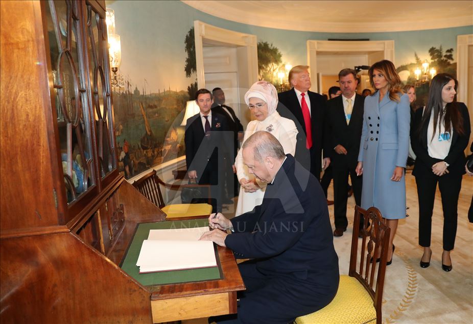WASHINGTON, USA - NOVEMBER 13: (----EDITORIAL USE ONLY – MANDATORY CREDIT - "TURKISH PRESIDENCY / MURAT CETINMUHURDAR / HANDOUT" - NO MARKETING NO ADVERTISING CAMPAIGNS - DISTRIBUTED AS A SERVICE TO CLIENTS----) President of Turkey Recep Tayyip Erdogan (front) signs guest book as his wife Emine Erdogan (2nd L), US President Donald Trump (3rd L) and his wife Melania Trump (4th L) at the White House in Washington, United States on November 13, 2019.