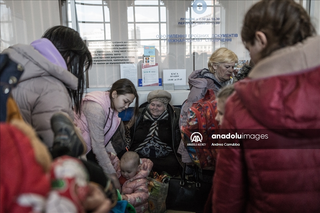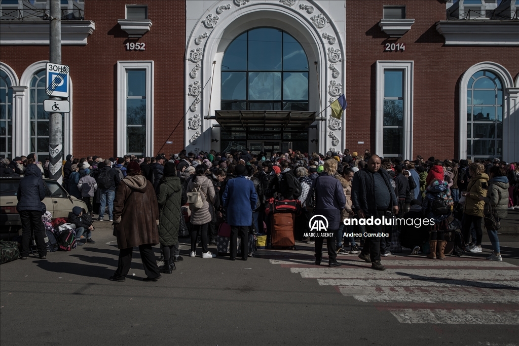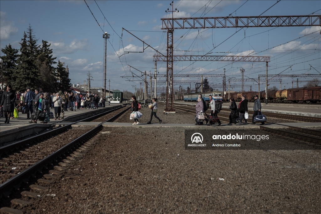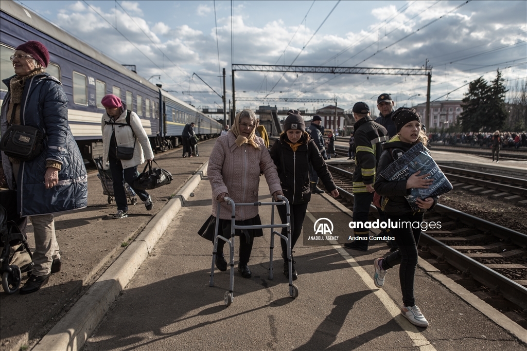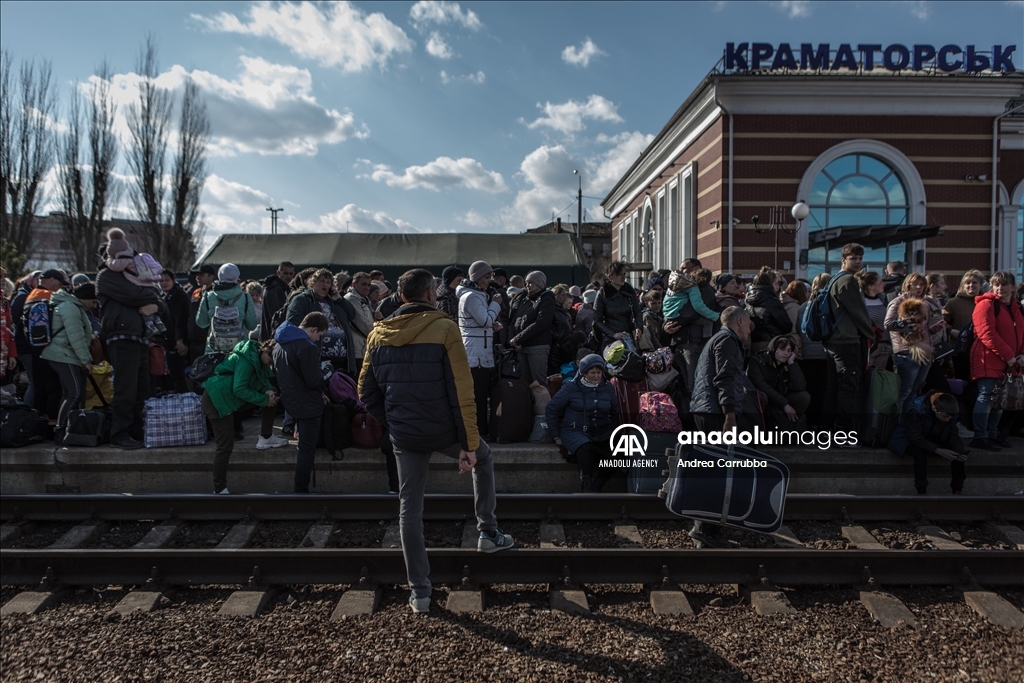 Civilians gather at the train station to be evacuated from combat zones in Kramatorsk, Donetsk Oblast, in eastern Ukraine on April 6, 2022. Civilians search to board the first available train headed west.