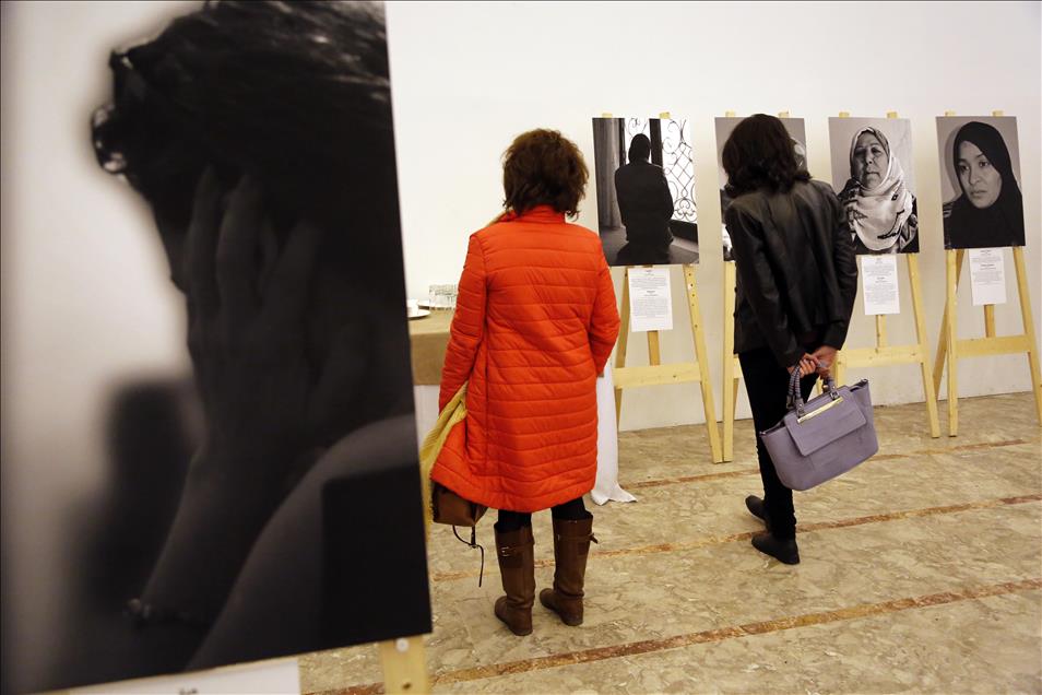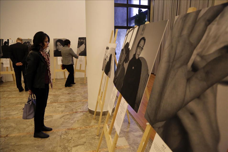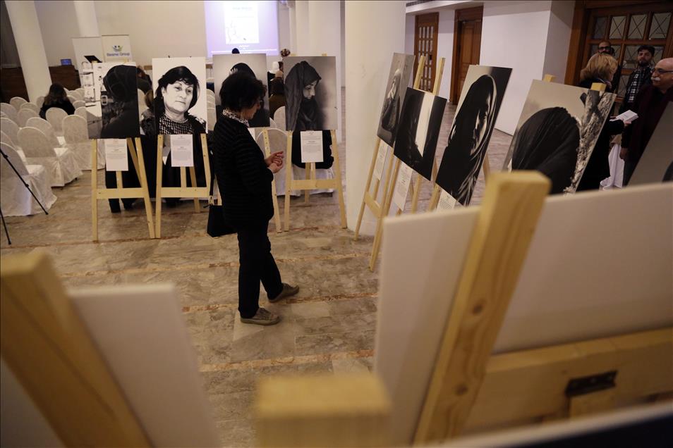 A visitor views the paintings at the Syrian Mothers exhibition in Beirut, Lebanon on February 16, 2017. A painting exhibition, a book introduction and a movie screening including interviews of 30 Syrian mothers, who have lost their children due to ongoing civil war in Syria, take place in Beirut.