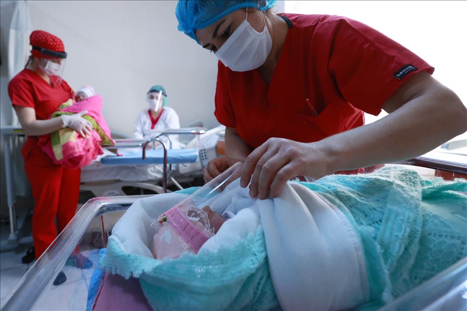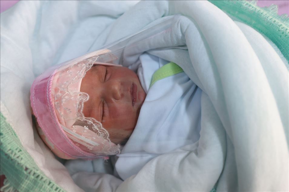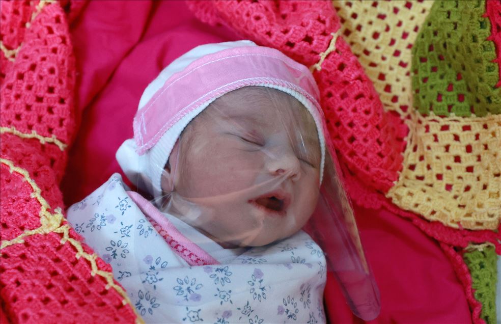 Face shield masks, generated by hospital staff were put on babies, born in the hospital, as part of the new type of coronavirus (Covid-19) measures.