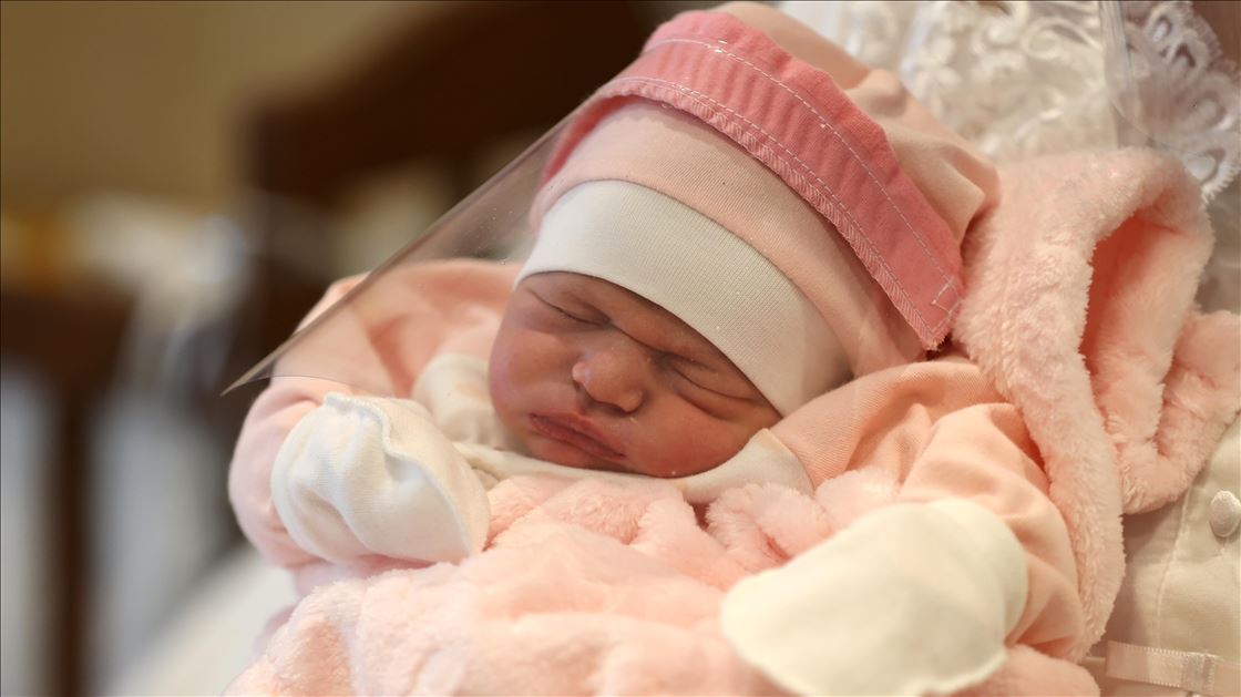 ANKARA, TURKEY - APRIL 22: A photo shows a newborn baby with a face shield mask, at University of Health Sciences Etlik Zubeyde Hanim Gynecological Diseases Training and Research Hospital in Ankara, Turkey on April 22, 2020. Face shield masks, generated by hospital staff were put on babies, born in the hospital, as part of the new type of coronavirus (Covid-19) measures.