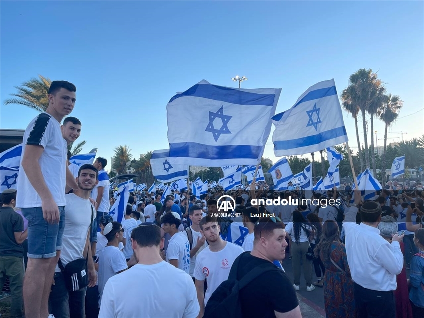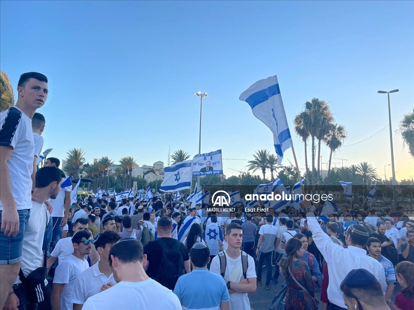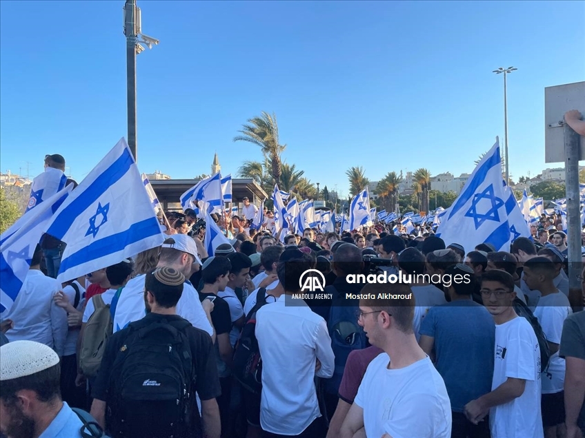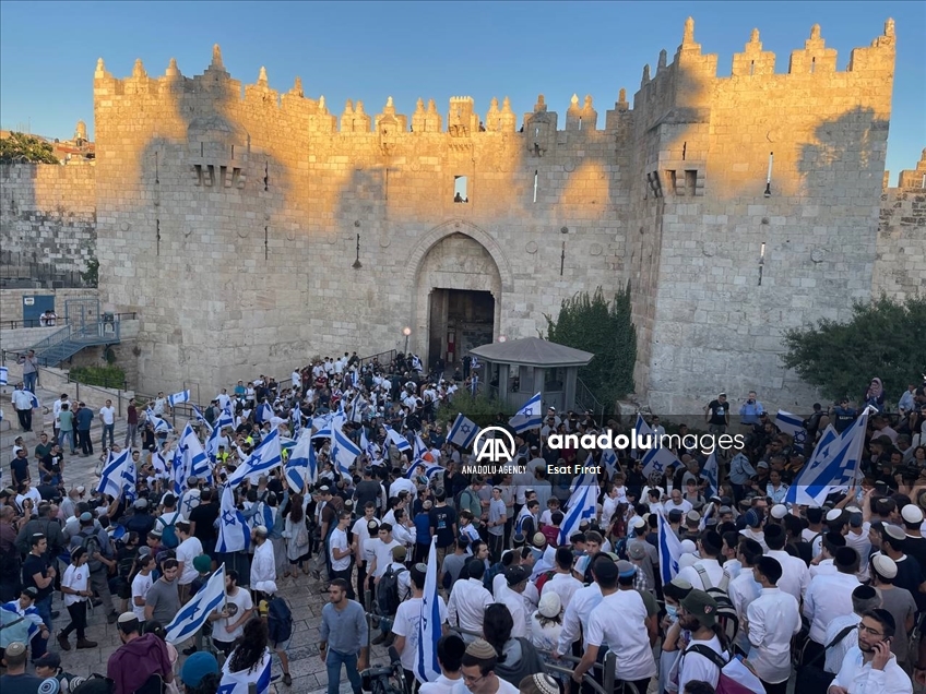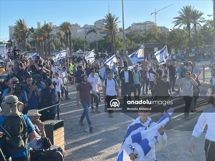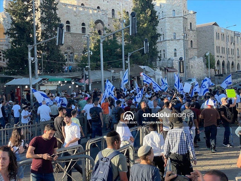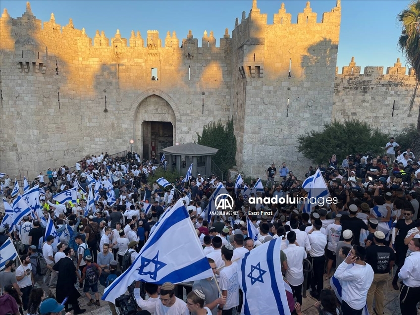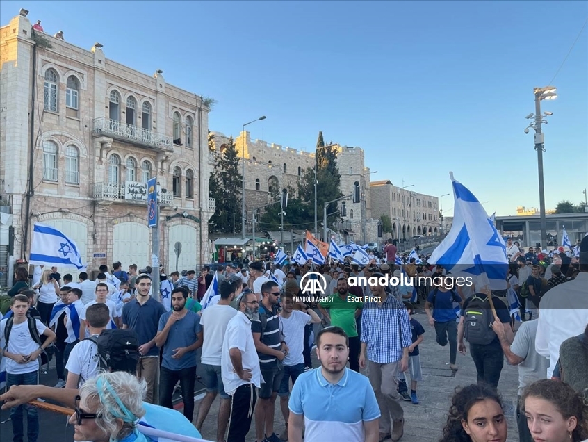 Far-right Israelis holding Israeli flags stage "flag march" starting from Ha-Nevi'im Street towards Damascus Gate (Bab al-Amud) in OId Town neighborhood of Jerusalem