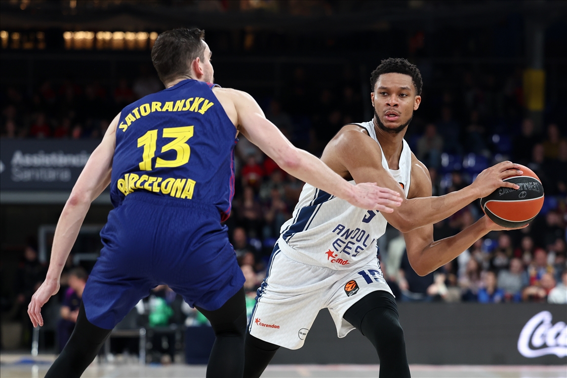 BARCELONA, SPAIN - MARCH 24: Ercan Osmani of Anadolu Efes Istanbul competes against Will Clyburn (L) of FC Barcelona during the EuroLeague Regular Season Round 33 match at Palau Blaugrana in Barcelona, Spain, on March 24, 2026. ( Adria Puig - Anadolu Agency )Adria Puig
