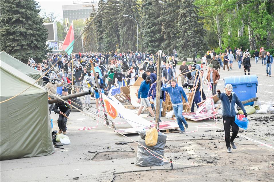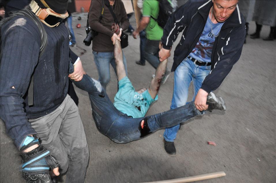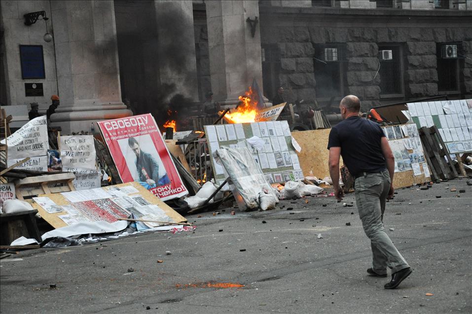 A clash between pro-Russian and pro-Ukrainian activists, which was started today in the centre of Odessa, moved to the Kulikovo field - the area in which until today the pro-Russian activists` camp was situated. Pro-Ukrainian activists defeated pro-Russian camp. A part of pro-Russians hid in a building of Labour Unions located not far from Kulikovo field. The building burst into flame. According to official information in a fire died 38 people. 30 were poisoned by carbon monoxide , 8 - jumped through windows to escape the fire. 50 people asked for medical care, 10 of them - policemen . Firefighters managed to put out the building. Before this incident in today`s clashes in Odessa three people had died. Maksym Voytenko