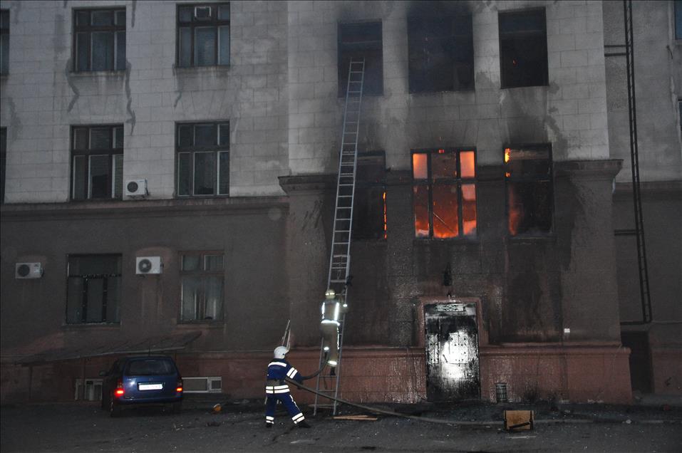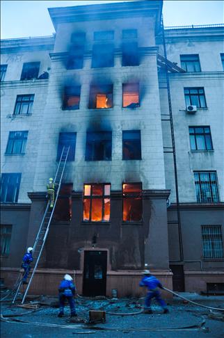 A clash between pro-Russian and pro-Ukrainian activists, which was started today in the centre of Odessa, moved to the Kulikovo field - the area in which until today the pro-Russian activists` camp was situated. Pro-Ukrainian activists defeated pro-Russian camp. A part of pro-Russians hid in a building of Labour Unions located not far from Kulikovo field. The building burst into flame. According to official information in a fire died 38 people. 30 were poisoned by carbon monoxide , 8 - jumped through windows to escape the fire. 50 people asked for medical care, 10 of them - policemen . Firefighters managed to put out the building. Before this incident in today`s clashes in Odessa three people had died.Maksym Voytenko