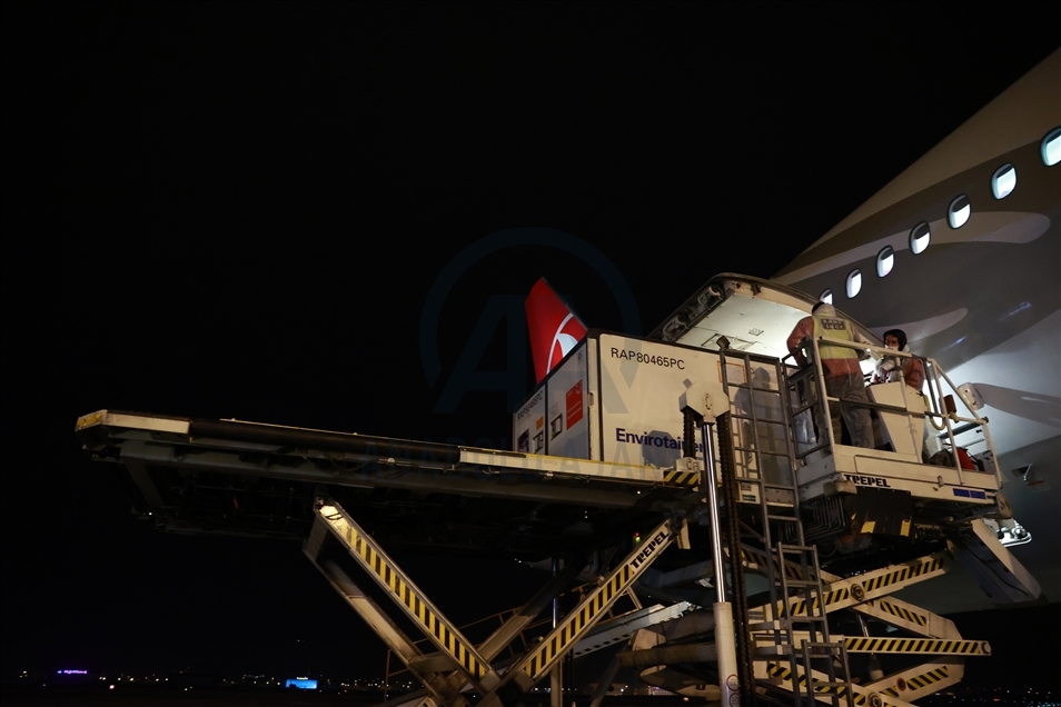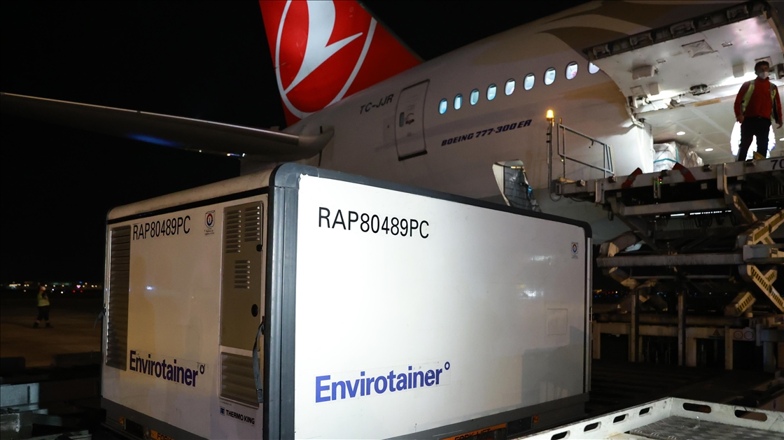 ANKARA, TURKEY - DECEMBER 30: Containers, carrying doses of Chinese SinoVac COVID-19 vaccines, are unloaded from a Turkish Airlines plane that brought the first batch of vaccines from China at the Esenboga Airport in capital Ankara, Turkey on December 30, 2020. The Boeing 777 plane, which departed from Beijing with 17 containers of vaccines, landed at Esenboga Airport at 5.44 a.m. local time (0244 GMT). ( Mehmet Ali Özcan - Anadolu Agency )Mehmet Ali Özcan