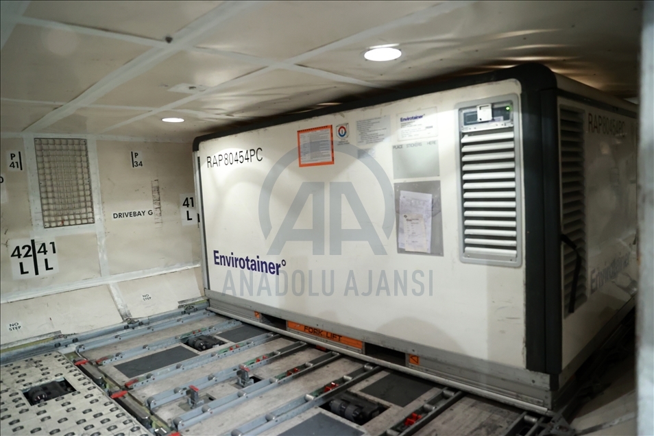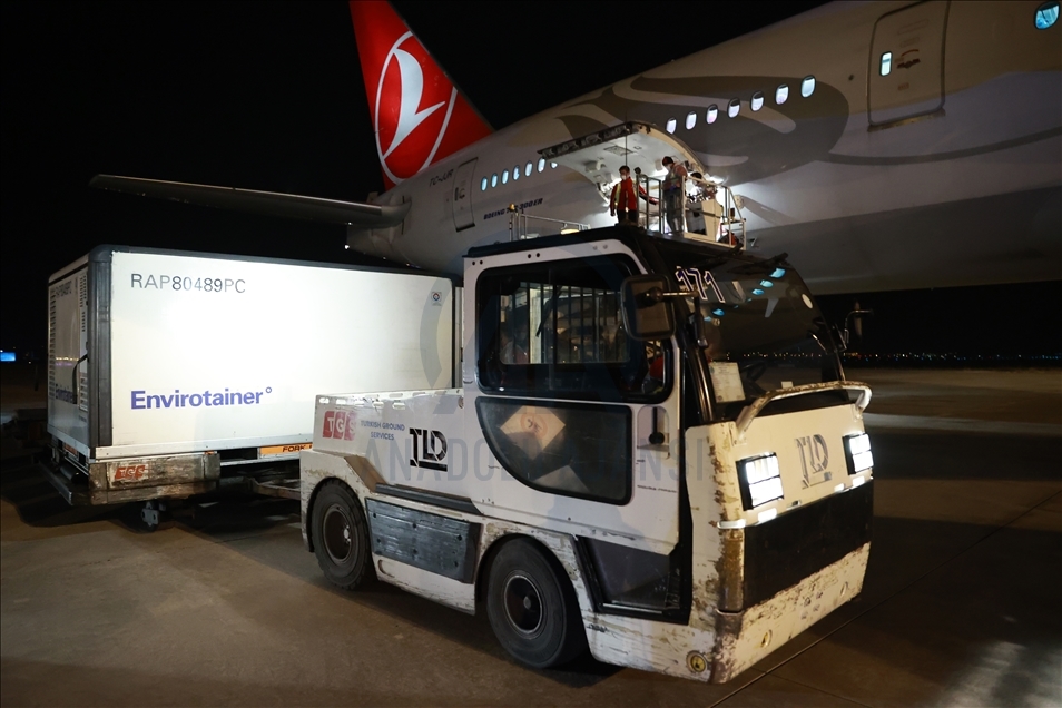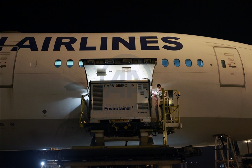 ANKARA, TURKEY - DECEMBER 30: Containers containing vaccines are taken from the Turkish Airlines plane, carrying first batch of Chinese SinoVac COVID-19 vaccines, and carrying to storages upon its arrival at the Esenboga Airport in capital Ankara, Turkey on December 30, 2020. The Boeing 777 plane, which departed from Beijing with 17 containers of vaccines, landed at Esenboga Airport at 5.44 a.m. local time (0244 GMT). ( Aytuğ Can Sencar - Anadolu Agency )Aytuğ Can Sencar