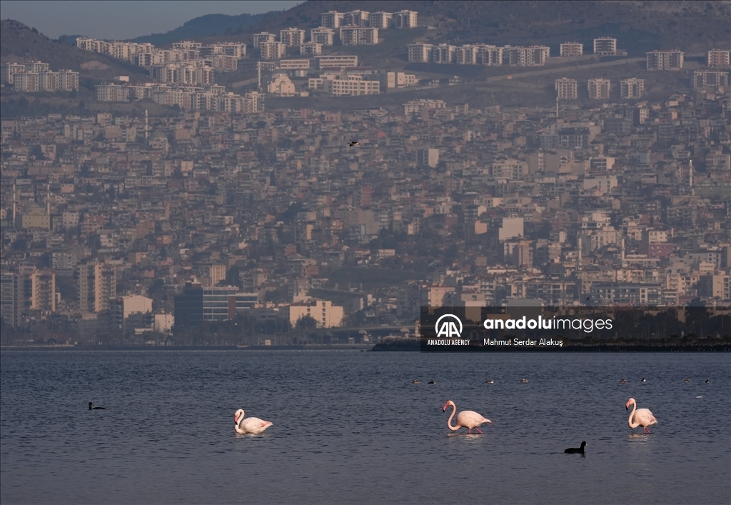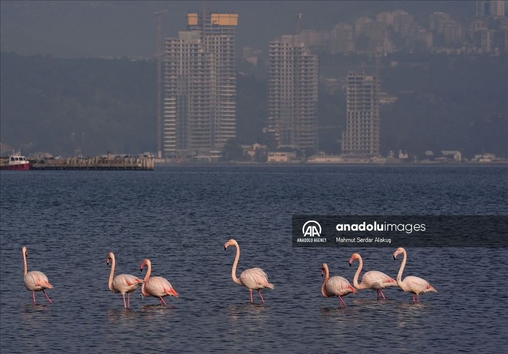 IZMIR, TURKIYE - FEBRUARY 05: Flamingos are feeding in the inner bay of Izmir, Turkiye on February 05, 2025. Some of the flamingos, whose habitat is the Gediz Delta in Izmir, head to the inner bay in search of food during the winter months and continue to feed in the inner bay throughout the day. Flamingos move in the shallow waters of Izmir Bay to find food during the winter months, come to areas such as Alsancak Port and Meles Delta in the inner gulf and approach the city center. ( Mahmut Serdar Alakuş - Anadolu Agency )Mahmut Serdar Alakuş