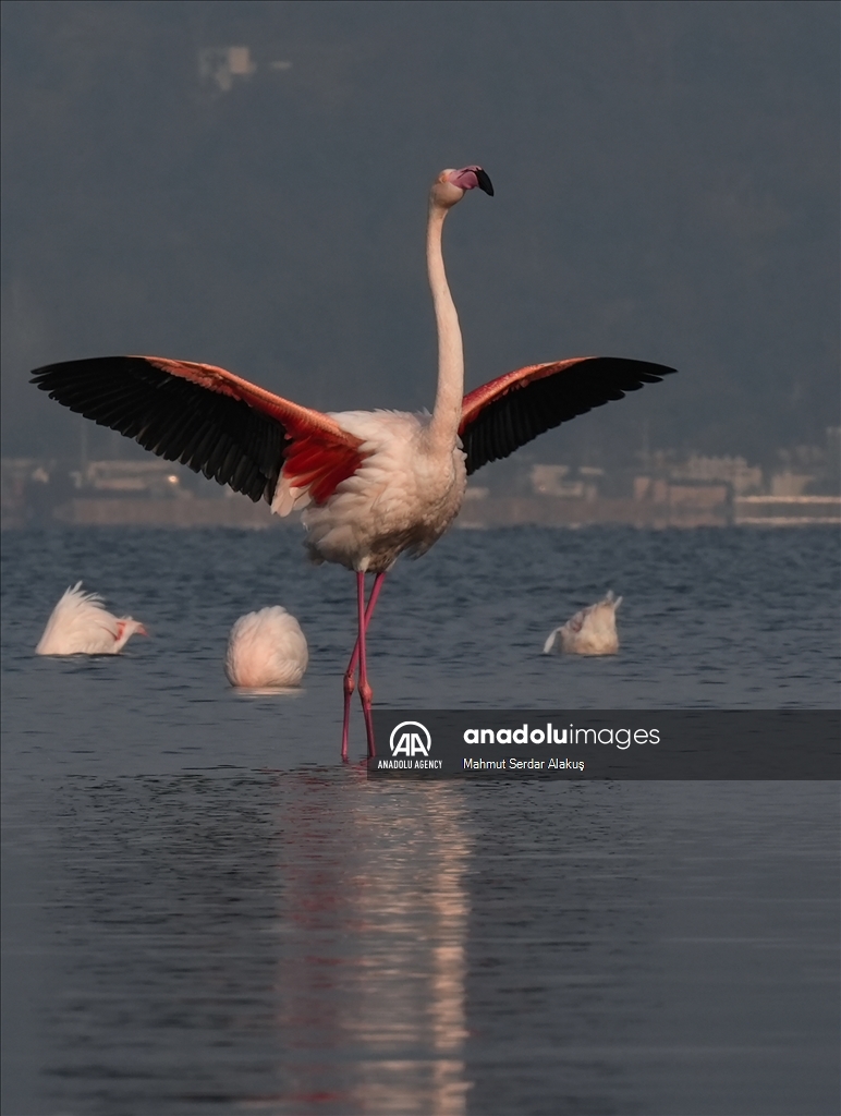IZMIR, TURKIYE - FEBRUARY 05: A flamingo is seen with its wings spread as other flamingos are feeding in the inner bay of Izmir, Turkiye on February 05, 2025. Some of the flamingos, whose habitat is the Gediz Delta in Izmir, head to the inner bay in search of food during the winter months and continue to feed in the inner bay throughout the day. Flamingos move in the shallow waters of Izmir Bay to find food during the winter months, come to areas such as Alsancak Port and Meles Delta in the inner gulf and approach the city center. ( Mahmut Serdar Alakuş - Anadolu Agency )Mahmut Serdar Alakuş