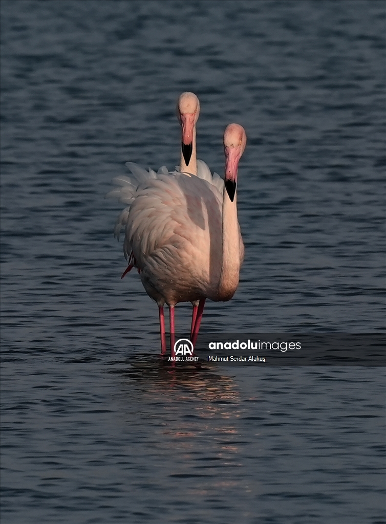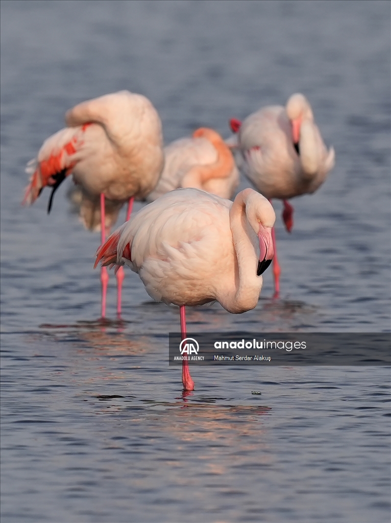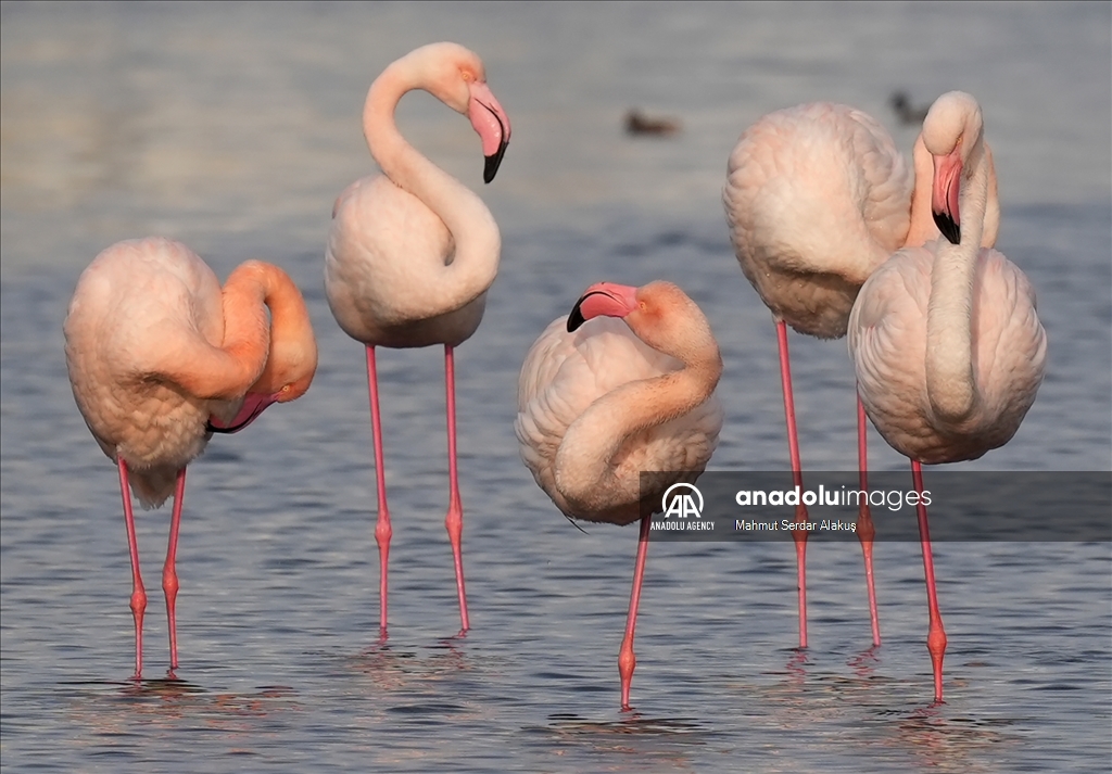 Some of the flamingos, whose habitat is the Gediz Delta in Izmir, head to the inner bay in search of food during the winter months and continue to feed in the inner bay throughout the day.