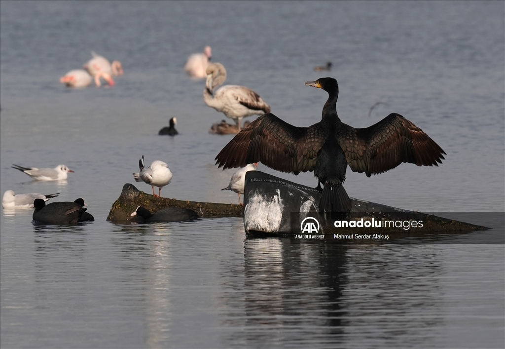 IZMIR, TURKIYE - FEBRUARY 05: A cormorant spreads its wings and sunbathes as flamingos are feeding in the inner bay of Izmir, Turkiye on February 05, 2025. Some of the flamingos, whose habitat is the Gediz Delta in Izmir, head to the inner bay in search of food during the winter months and continue to feed in the inner bay throughout the day. Flamingos move in the shallow waters of Izmir Bay to find food during the winter months, come to areas such as Alsancak Port and Meles Delta in the inner gulf and approach the city center. ( Mahmut Serdar Alakuş - Anadolu Agency )Mahmut Serdar Alakuş