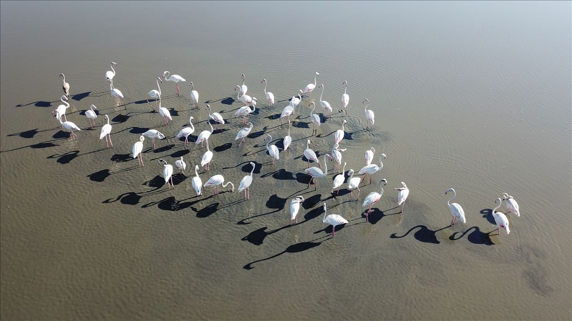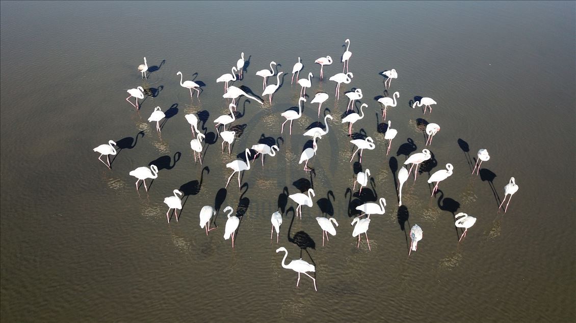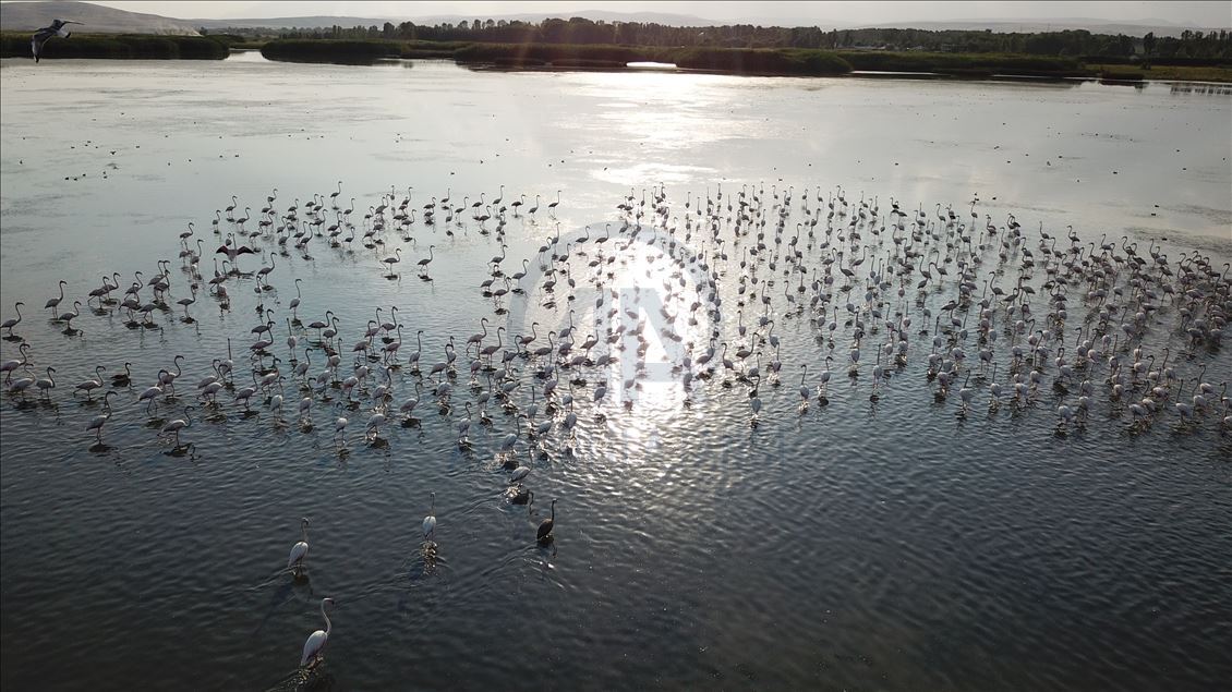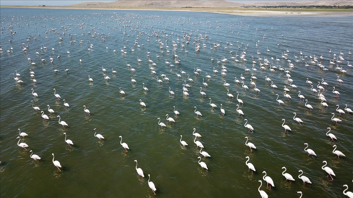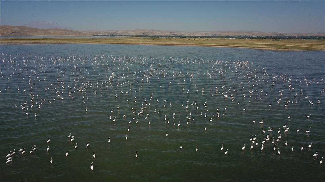 VAN, TURKEY - AUGUST 04: A drone photo show an aerial view of a flock of flamingos on Lake Van at Lake Van Basin on August 04, 2020 in Van province, Turkey. Lake Van, one of the most important temporary accommodation centers for migratory birds on the journey to Africa and draw attention of nature lovers and shutterbugs. ( Necmettin Karaca - Anadolu Agency )Necmettin Karaca