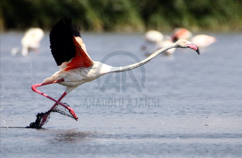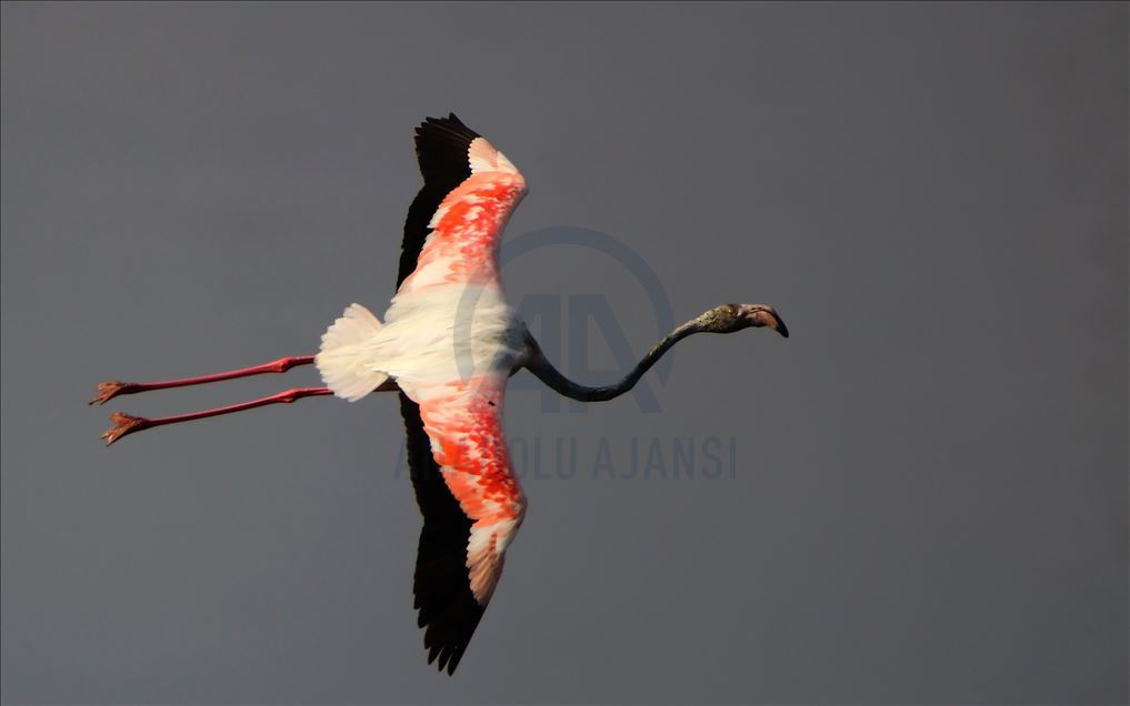 VAN, TURKEY - AUGUST 04: A flamingo flies over Lake Van at Lake Van Basin on August 04, 2020 in Van province, Turkey. Lake Van, one of the most important temporary accommodation centers for migratory birds on the journey to Africa and draw attention of nature lovers and shutterbugs. ( Necmettin Karaca - Anadolu Agency )Necmettin Karaca