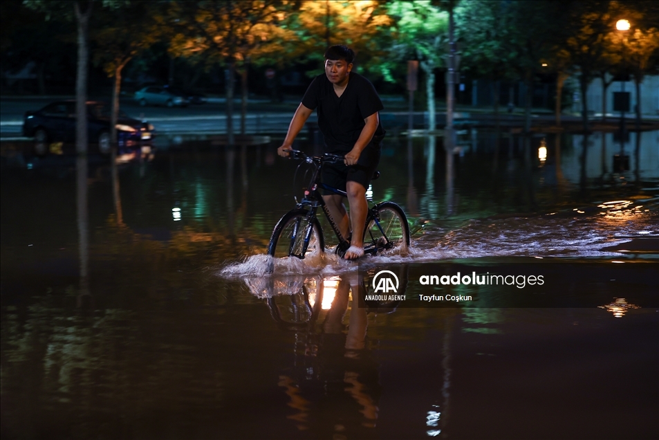 NEW JERSEY, USA - SEPTEMBER 2: A man rides a bike on the flooded street in the Town of Bound Brook in New Jersey, United States on September 2, 2021. The death toll on the US East Coast from the remnants of Hurricane Ida rose to 45 Thursday after the region was hit by record rains and dangerous floods. ( Tayfun Coşkun - Anadolu Agency )Tayfun Coşkun