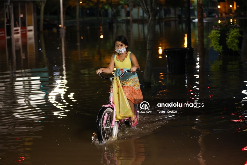 NEW JERSEY, USA - SEPTEMBER 2: A girl rides a bike on the flooded street in the Town of Bound Brook in New Jersey, United States on September 2, 2021. The death toll on the US East Coast from the remnants of Hurricane Ida rose to 45 Thursday after the region was hit by record rains and dangerous floods. ( Tayfun Coşkun - Anadolu Agency )Tayfun Coşkun