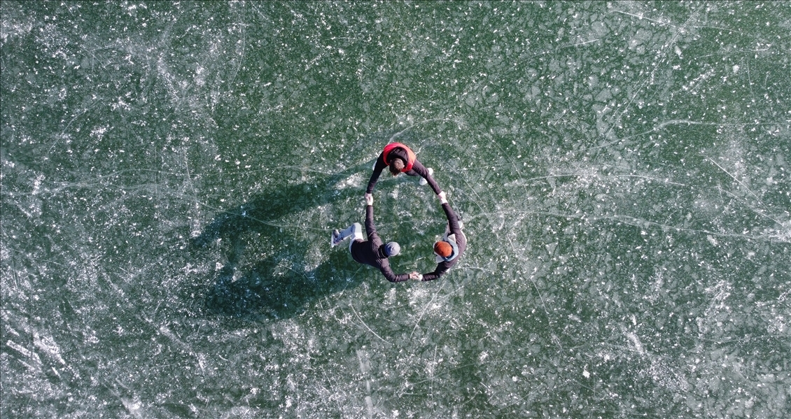 BAYBURT, TURKEY - JANUARY 03: Kids play on frozen Gokceder Pond after the air temperature dropped below zero during winter season in Bayburt, Turkey on January 03, 2021. ( Beşir Kelleci - Anadolu Agency )Beşir Kelleci