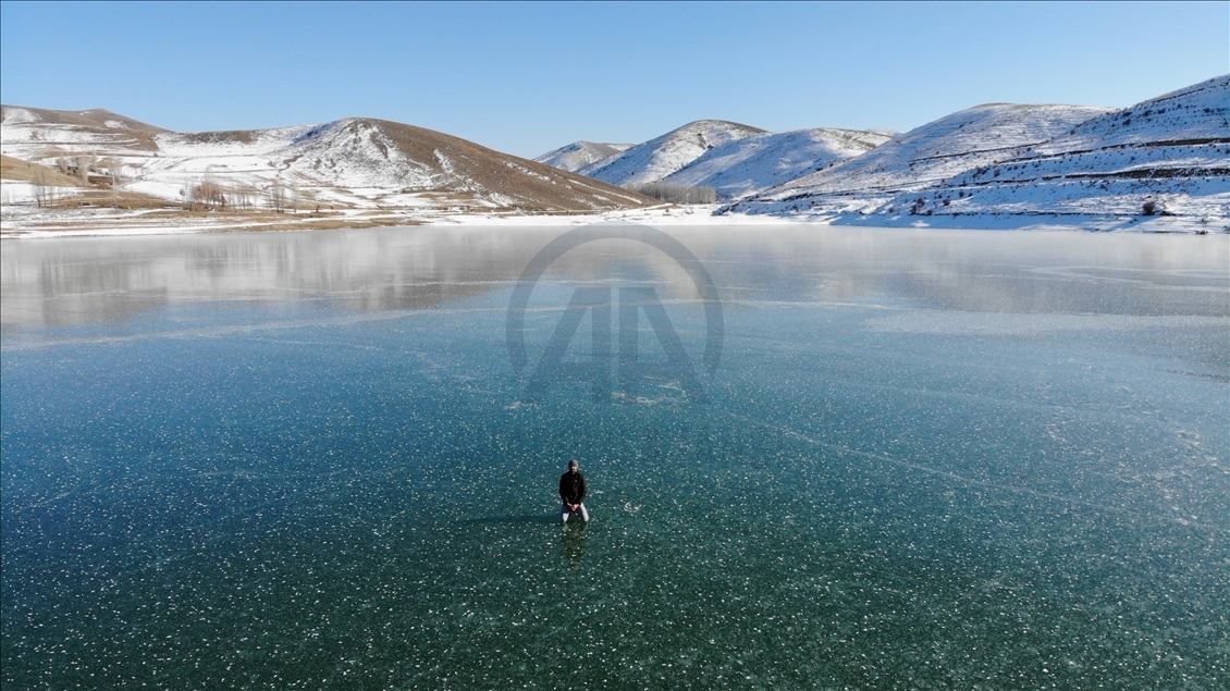 BAYBURT, TURKEY - JANUARY 03: A man is seen on frozen Gokceder Pond after the air temperature dropped below zero during winter season in Bayburt, Turkey on January 03, 2021. ( Beşir Kelleci - Anadolu Agency )Beşir Kelleci
