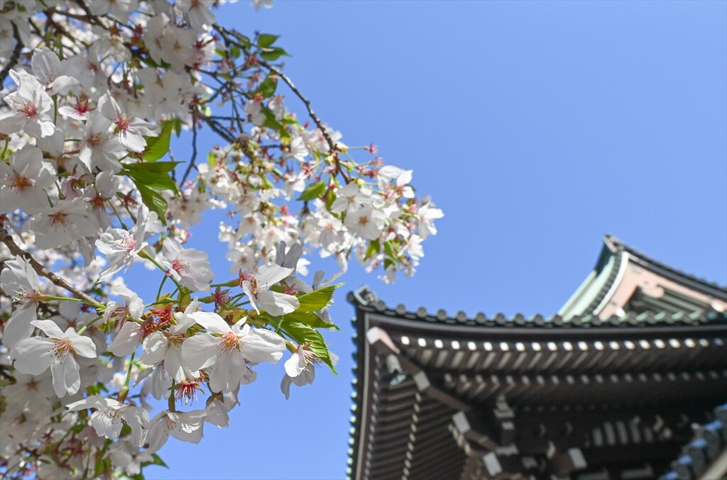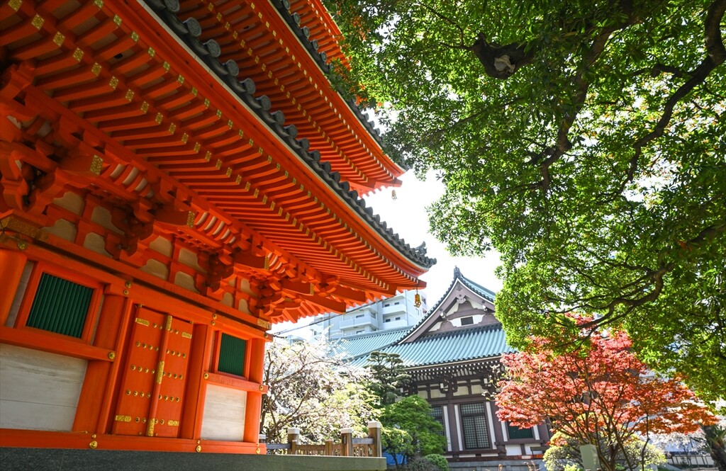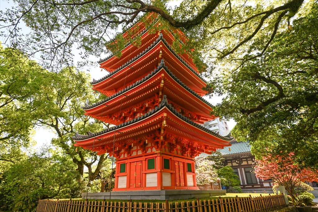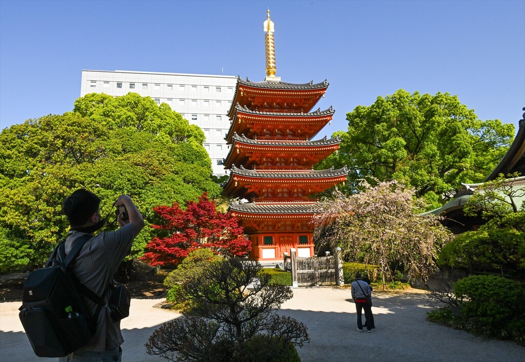 The five-story red pagoda of Tochoji Temple stands framed by late-season cherry blossoms during Hanamatsuri (Buddha's Birthday) in Fukuoka, Japan, on April 8, 2026.