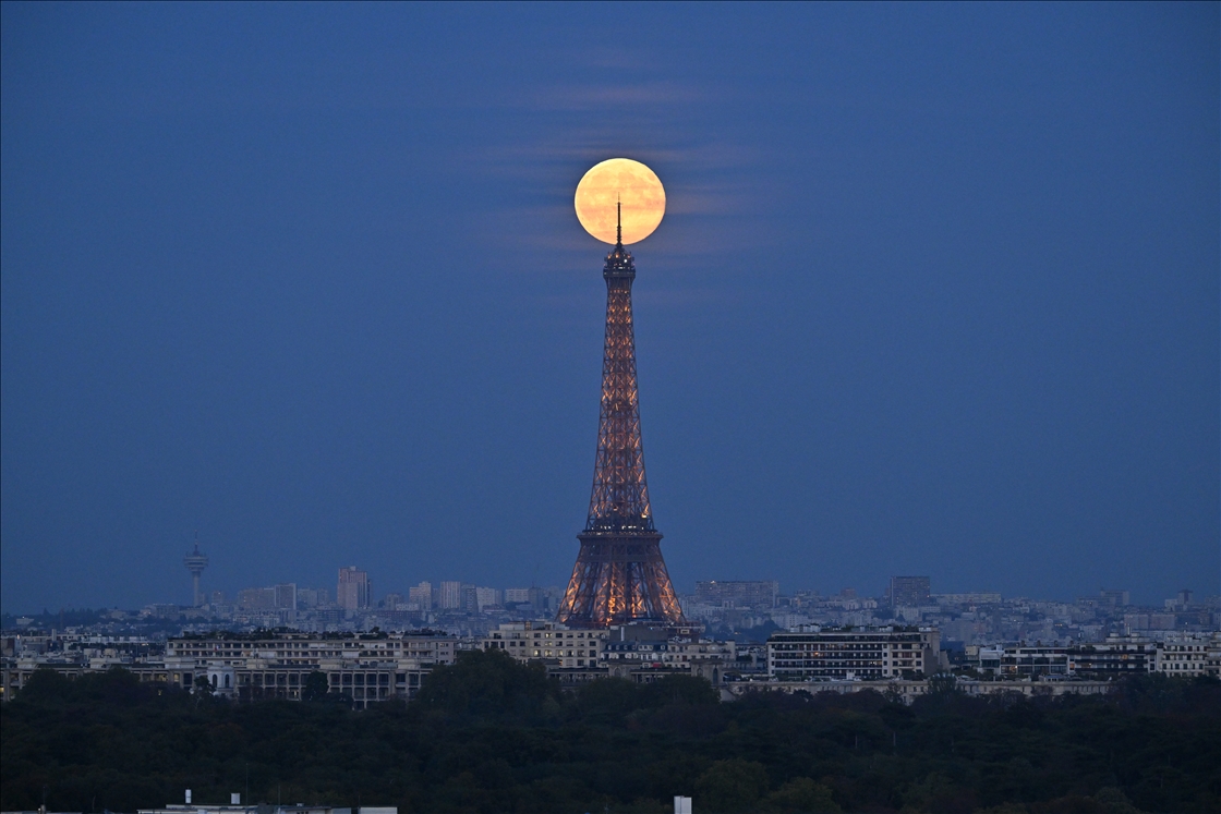 PARIS, FRANCE - OCTOBER 07: The full Harvest Supermoon rises over Paris, with a view of the Eiffel Tower as seen from Saint-Cloud, France on October 7, 2025. ( Mustafa Yalçın - Anadolu Agency )