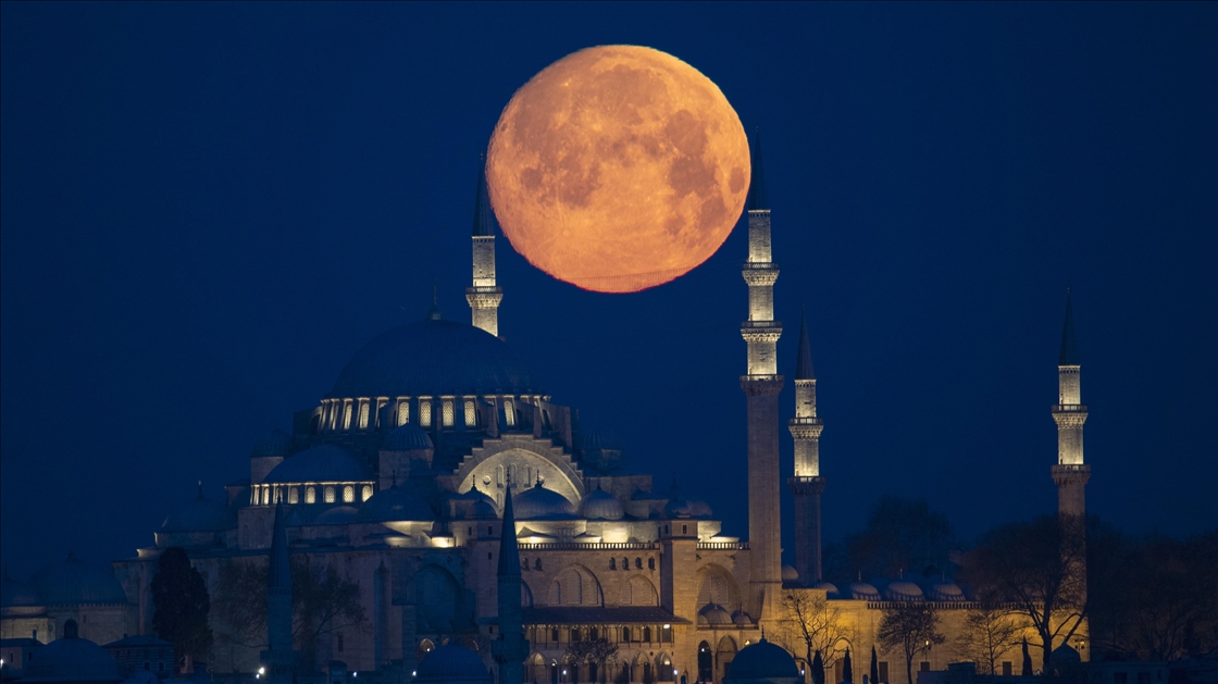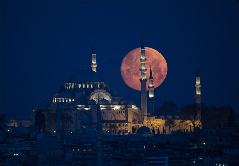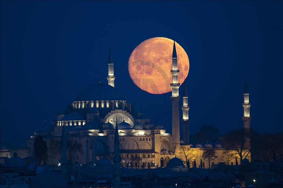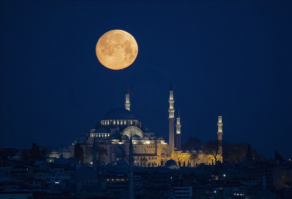 Full moon rises behind the Suleymaniye Mosque during the holy Islamic fasting month of Ramadan in Istanbul, Turkey on April 26, 2021.