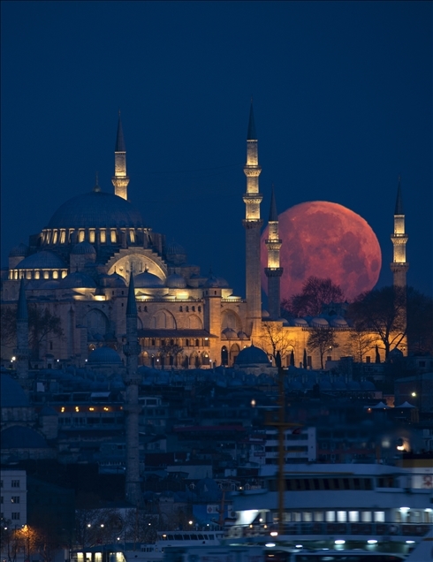 ISTANBUL, TURKEY - APRIL 26: Full moon rises over the Suleymaniye Mosque during the holy Islamic fasting month of Ramadan in Istanbul, Turkey on April 26, 2021. ( İsa Terli - Anadolu Agency )İsa Terli