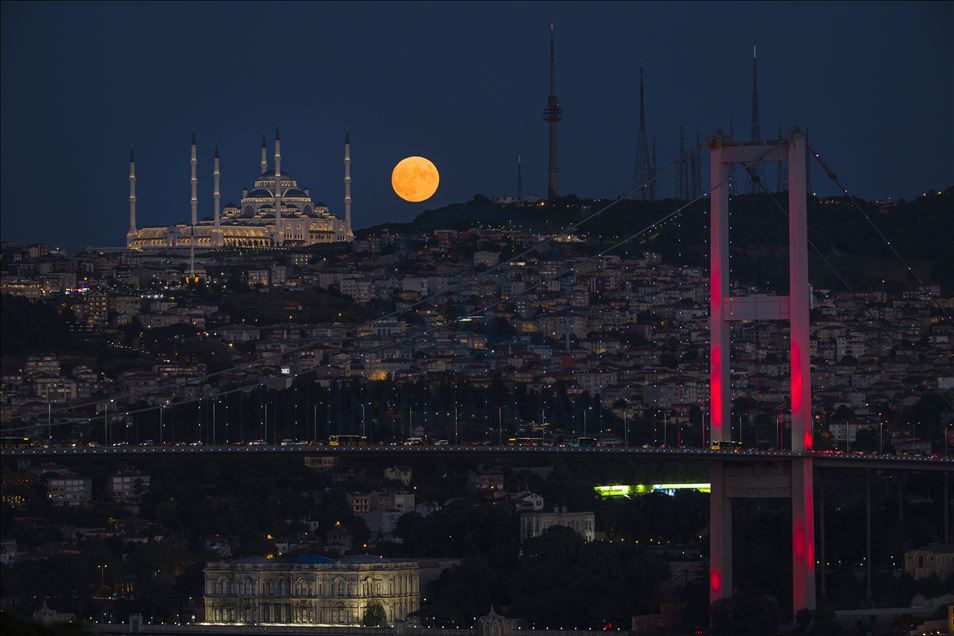 Full moon rises over Camlica Mosque and July 15 Martyrs' Bridge in Istanbul, Turkey on September 01, 2020.