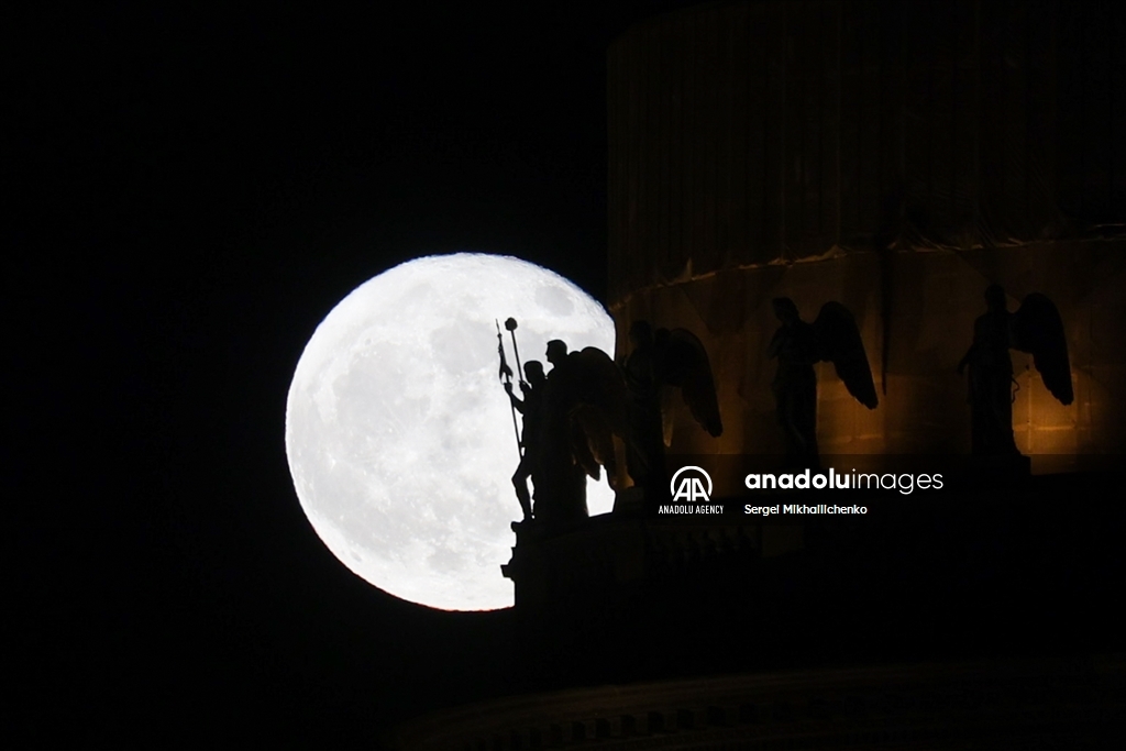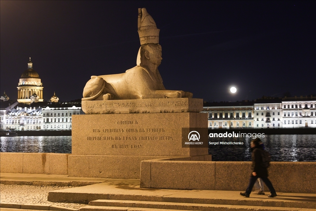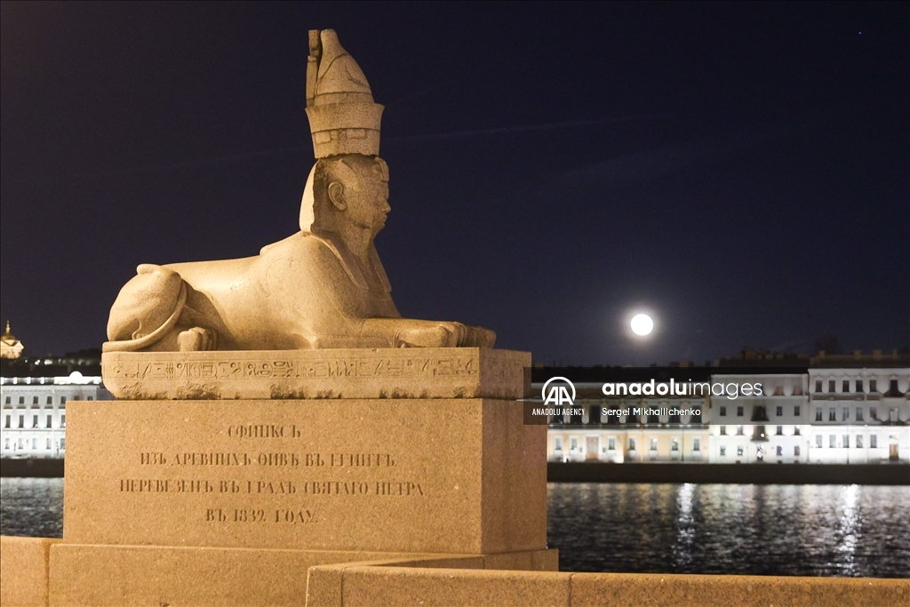 SAINT-PETERSBURG, RUSSIA - APRIL 13: Full moon is seen over sculpture of a Spinx at the Universitetskaya Embankment in Saint-PetersburgPetersburg, Russia on April 13, 2025. ( Sergei Mikhailichenko - Anadolu Agency )Sergei Mikhailichenko