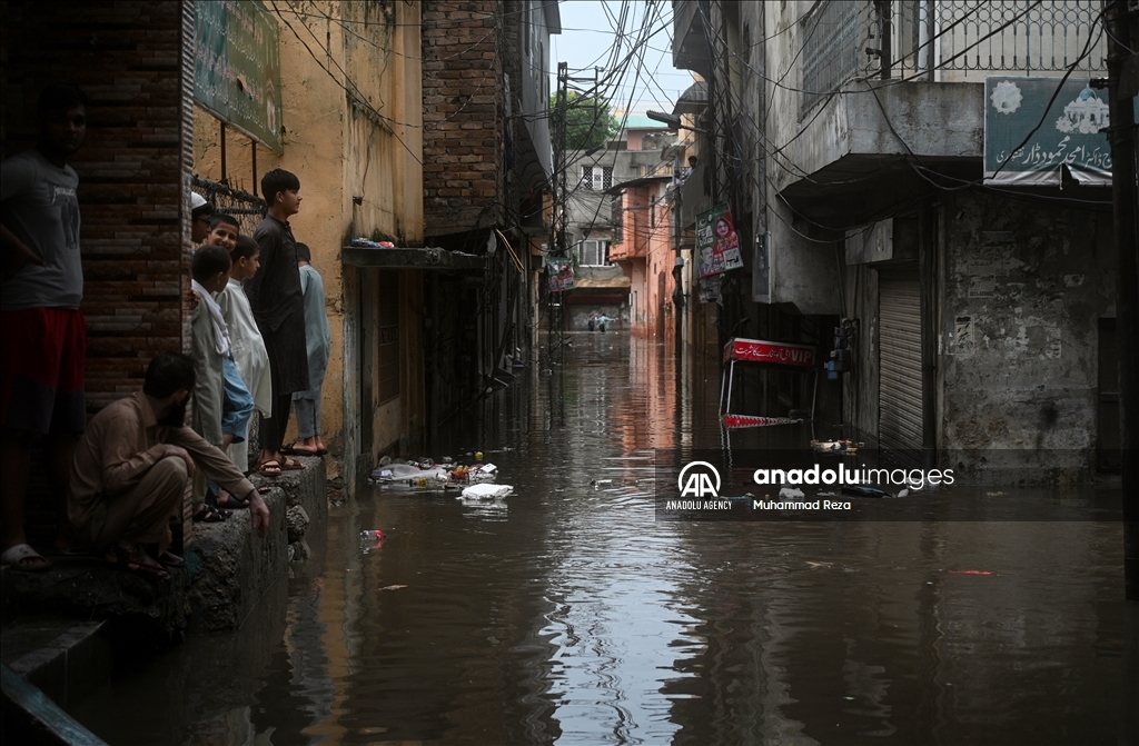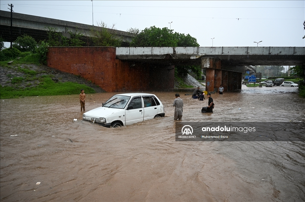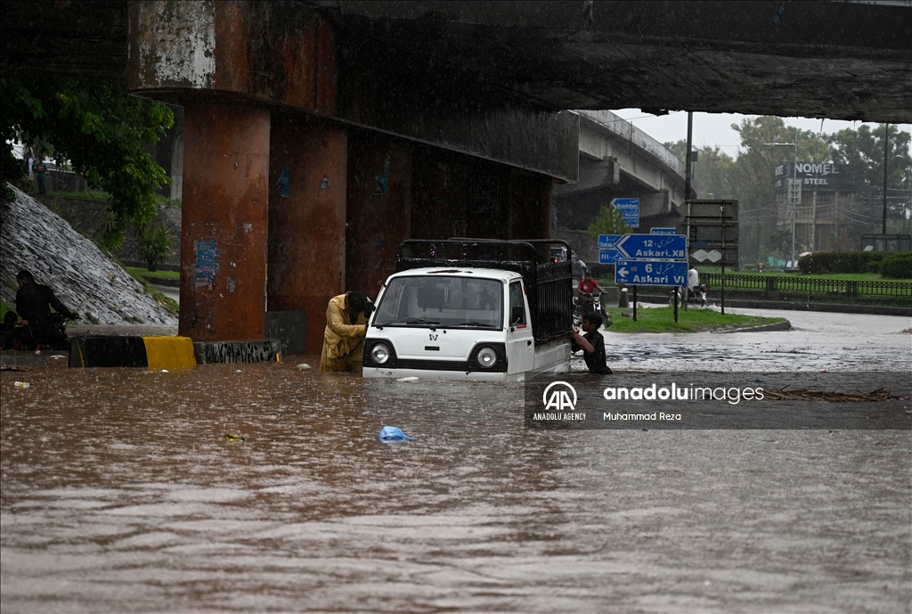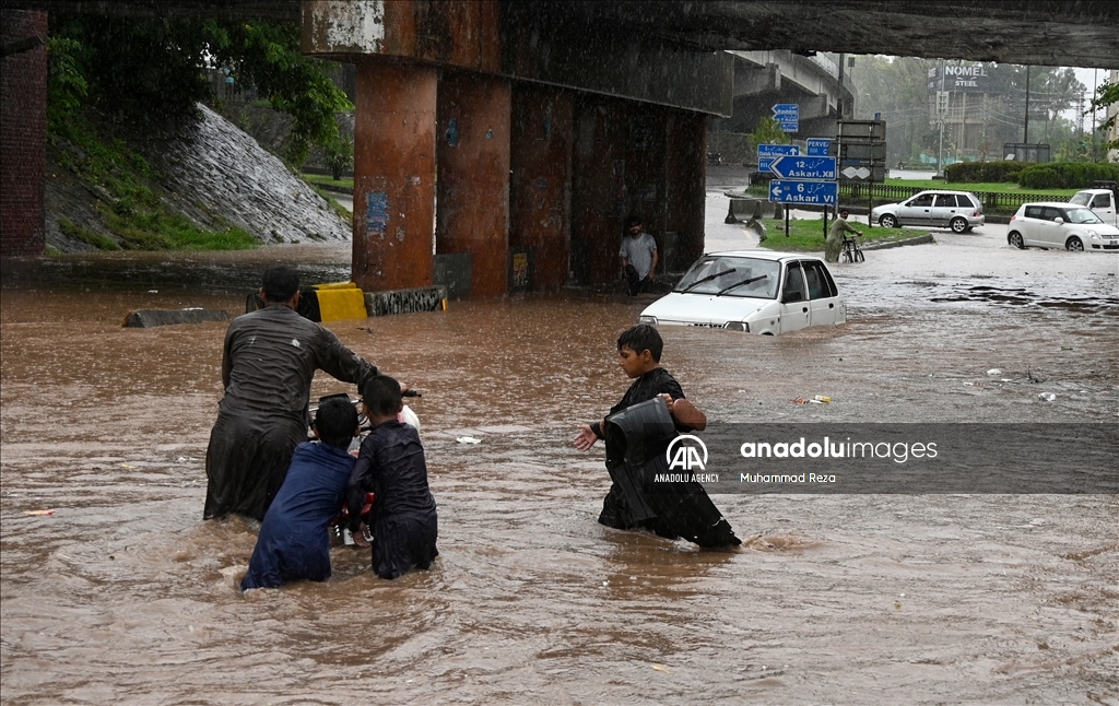 RAWALPINDI, PAKISTAN - JULY 29: Pakistanis struggle to drive their motorbikes and cars through flooded street following heavy rain in Rawalpindi, Pakistan on July 29, 2024. Heavy rains caused flood in low-lying areas in the city that damage to property. ( Muhammad Reza - Anadolu Agency )Muhammad Reza