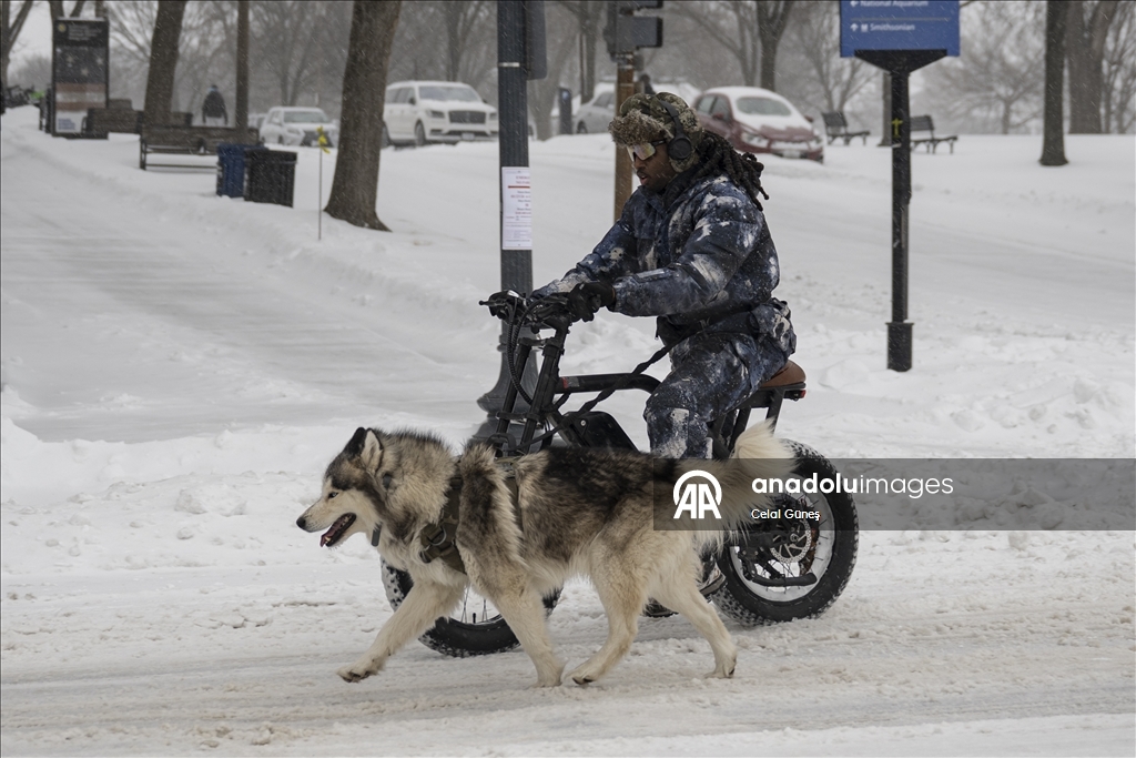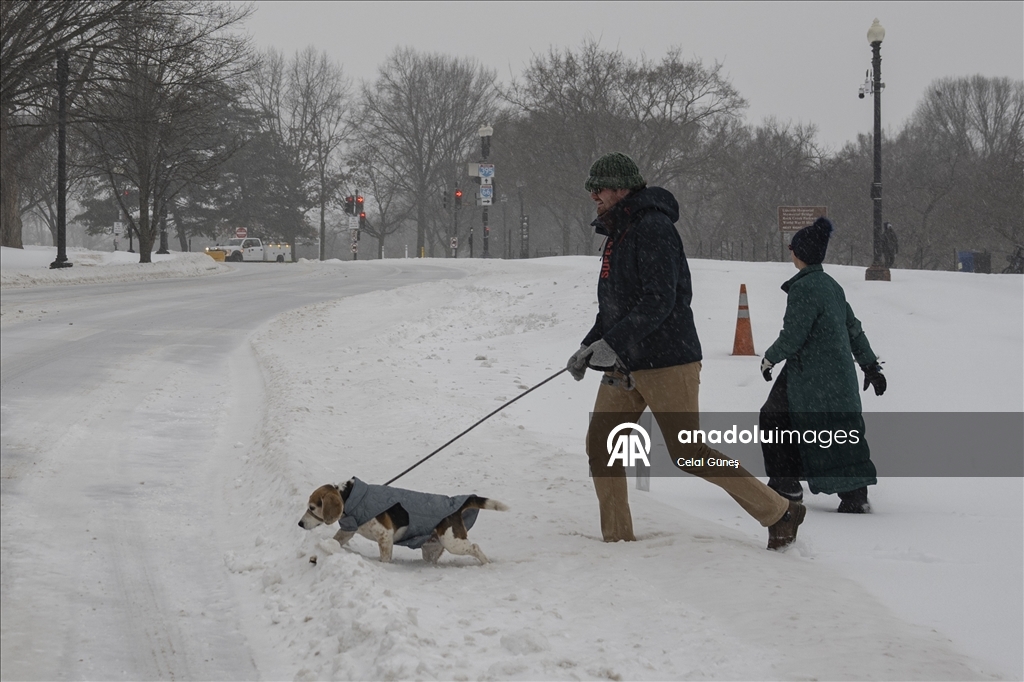 WASHINGTON DC, UNITED STATES - JANUARY 25: People walk with their dog during heavy snowfall that began late last night blanketed the US capital, Washington DC on January 25, 2026. ( Celal Güneş - Anadolu Agency )Celal Güneş