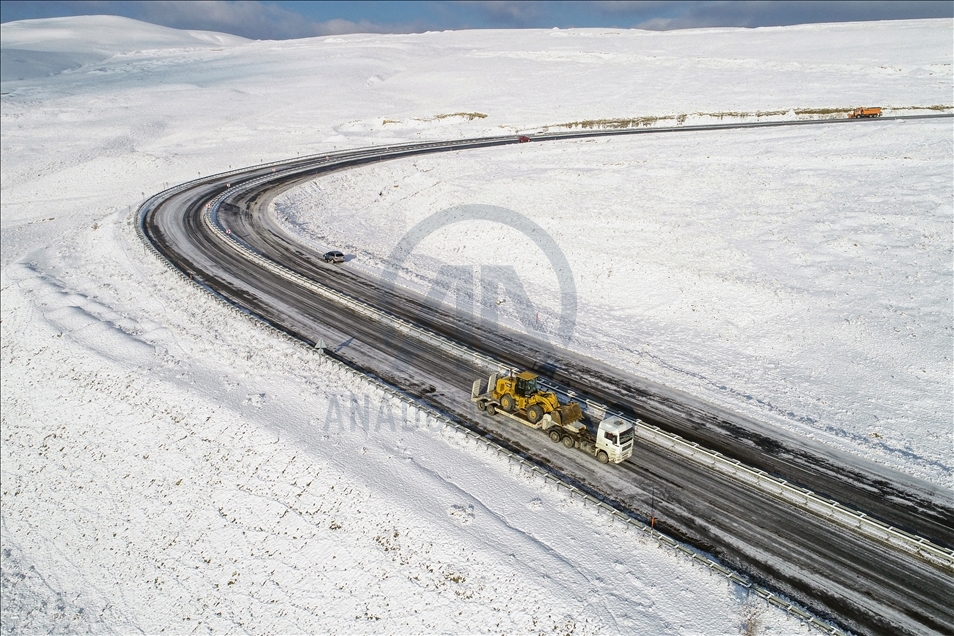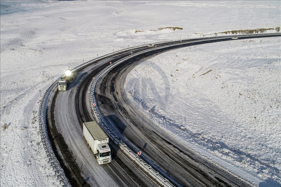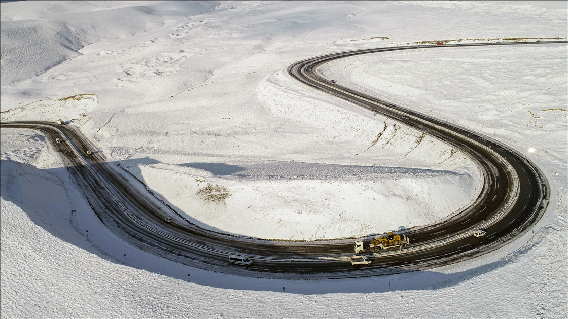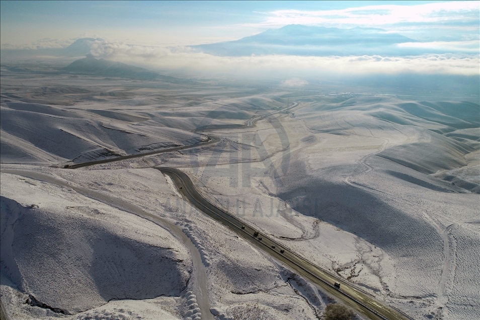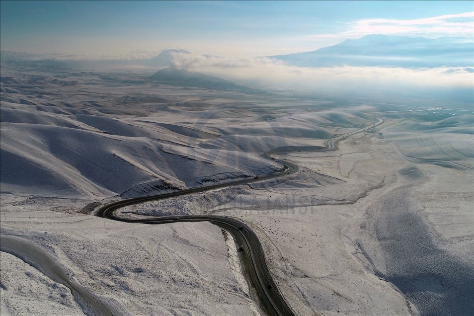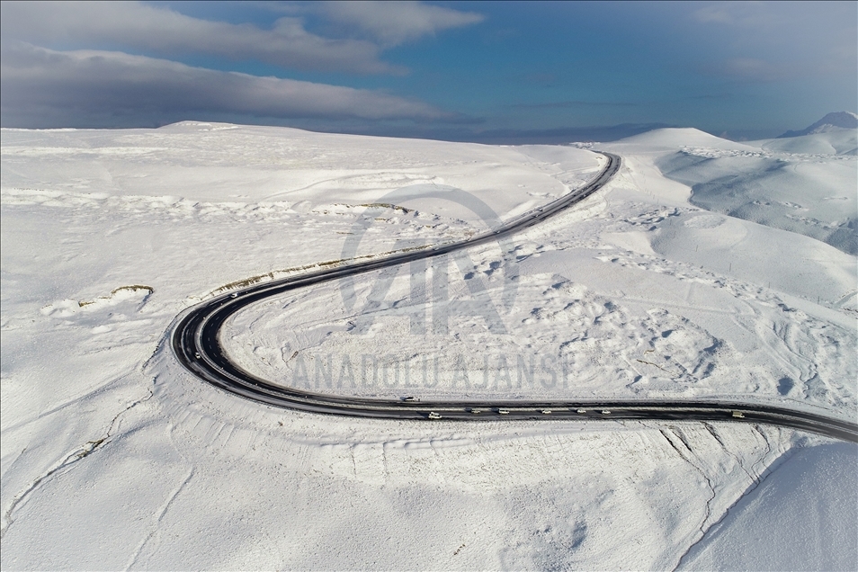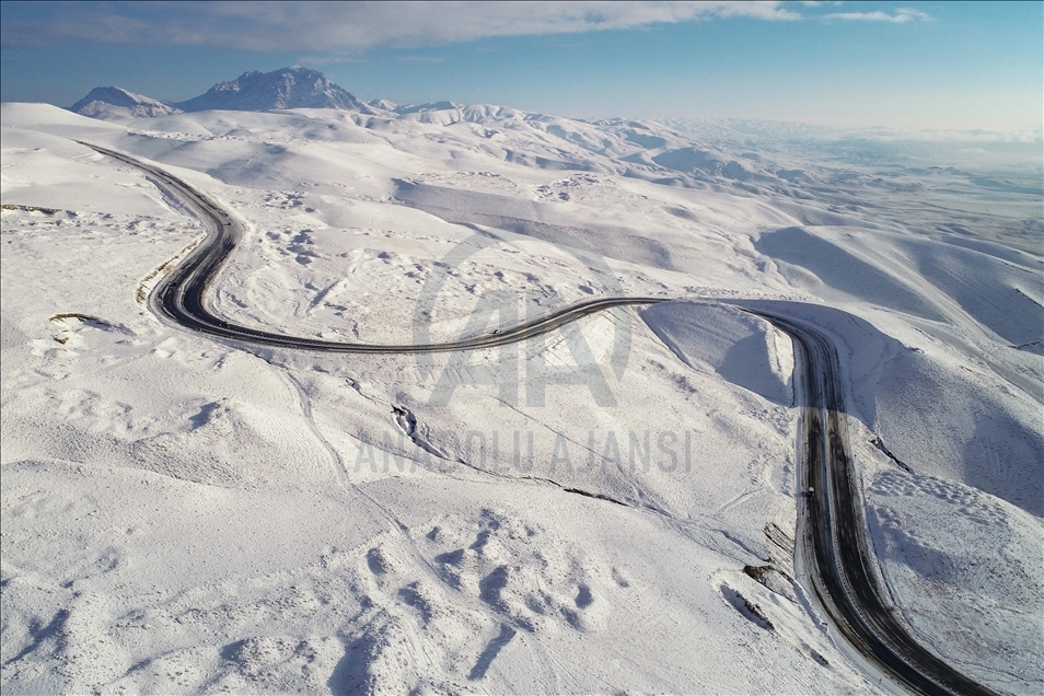 Drone photo shows an aerial view of snow covered Kurubas Pass at an altitude of 2 thousand 225 meters, in Van province of Turkey on December 11, 2020.