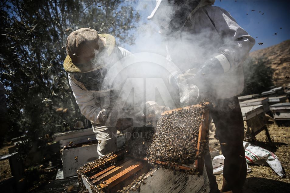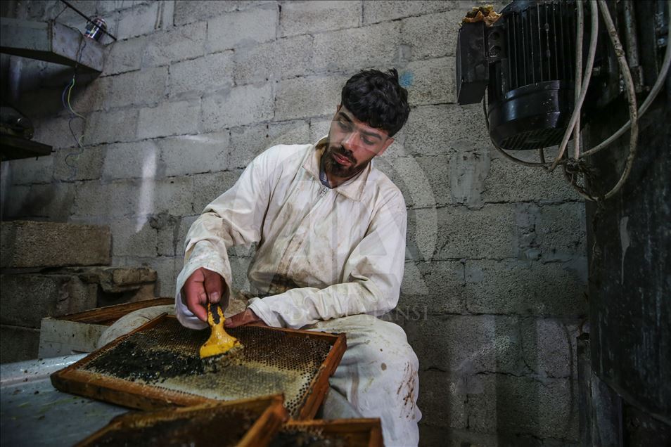 Palestinian apiarists keep bees in order to collect their honey as they begin harvesting honey at at honey filling facility in Rafah, Gaza on April 29, 2019. Honey productivity decreases due to lack of medicines used in beekeeping under Israeli blockade at the Rafah area in Gaza border.