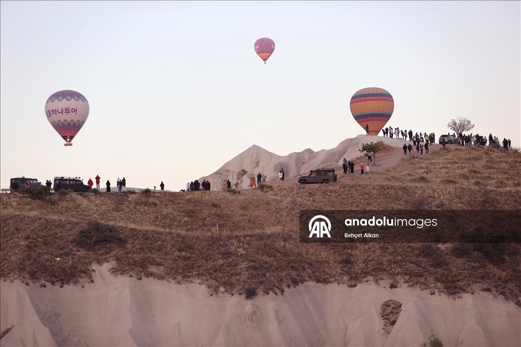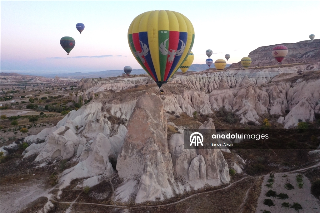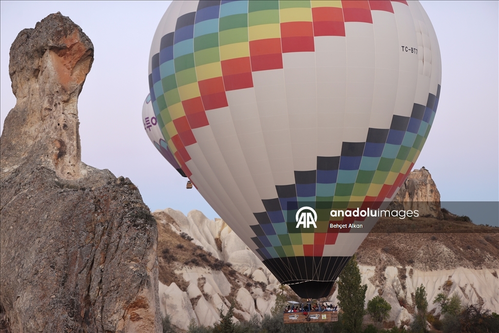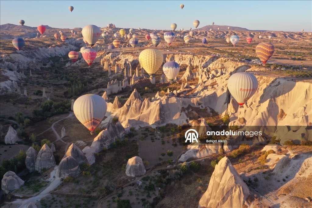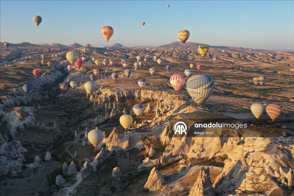NEVSEHIR, TURKIYE - OCTOBER 02: Hot air balloons fly over the fairy chimneys and valleys of Cappadocia, a UNESCO World Heritage Site, on October 02, 2025 in Nevsehir, Turkiye. Hot air balloons add colour to the fairy chimney-covered valley landscape in Cappadocia, one of Turkiye's four-season holiday destinations. Tourists who want to get a bird's eye view of geological formations that formed millions of years ago are interested in hot air balloon tours in Cappadocia. ( Behçet Alkan - Anadolu Agency )Behçet Alkan