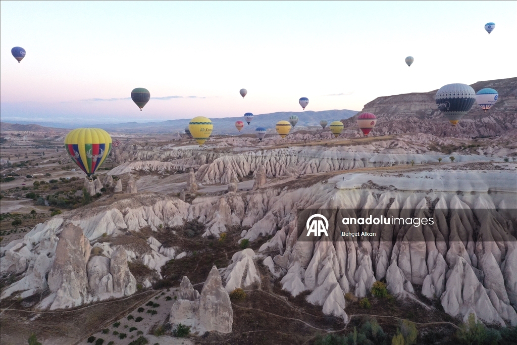 Hot air balloons fly over the fairy chimneys and valleys of Cappadocia, a UNESCO World Heritage Site in Nevsehir, Turkiye