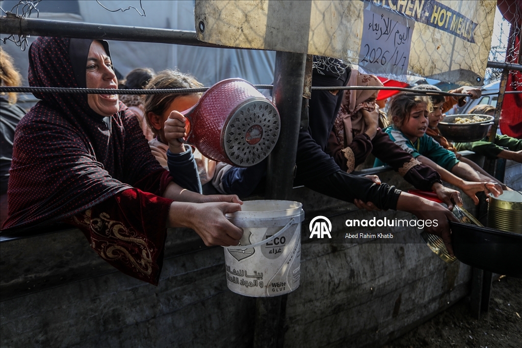 KHAN YUNIS, GAZA - JANUARY 7: Palestinians, mainly children, wait to get hot food distributed by a charity organization at al-Mawasi district of Khan Yunis, Gaza on January 7, 2026. ( Abed Rahim Khatib - Anadolu Agency )Abed Rahim Khatib
